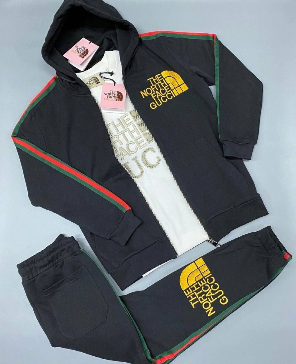 Этот спортивный костюм Gucci, артикул LUX-63307, сочетает в себе узнаваемый стиль бренда с элементами спортивной одежды. Комплект состоит из худи на молнии и брюк, выполненных в классическом черном цвете. Дизайн дополнен фирменными полосами Gucci на рукавах и штанинах, а также контрастными логотипами The North Face x Gucci, что придает изделию уникальность.