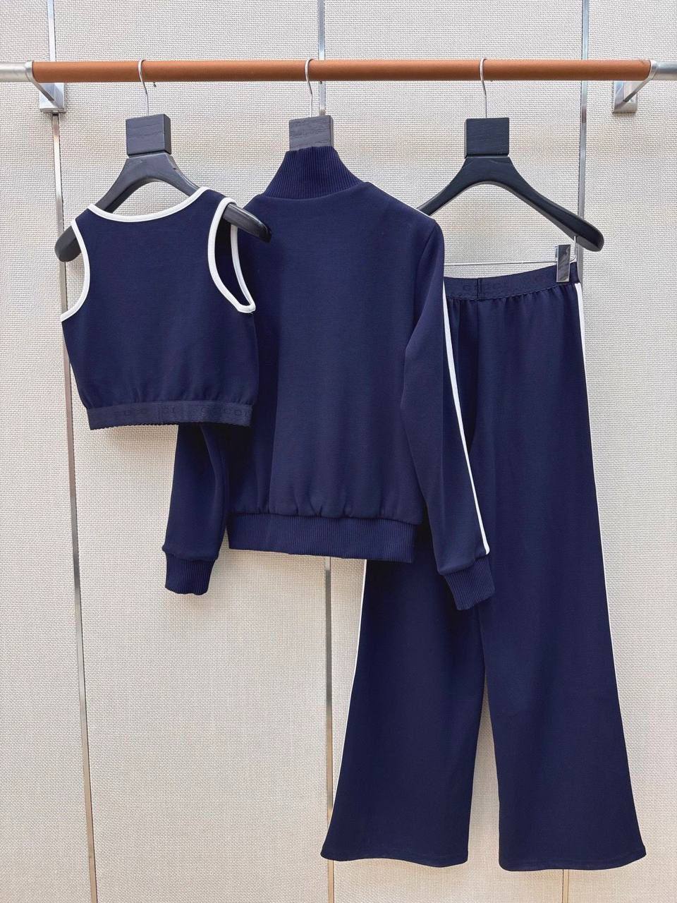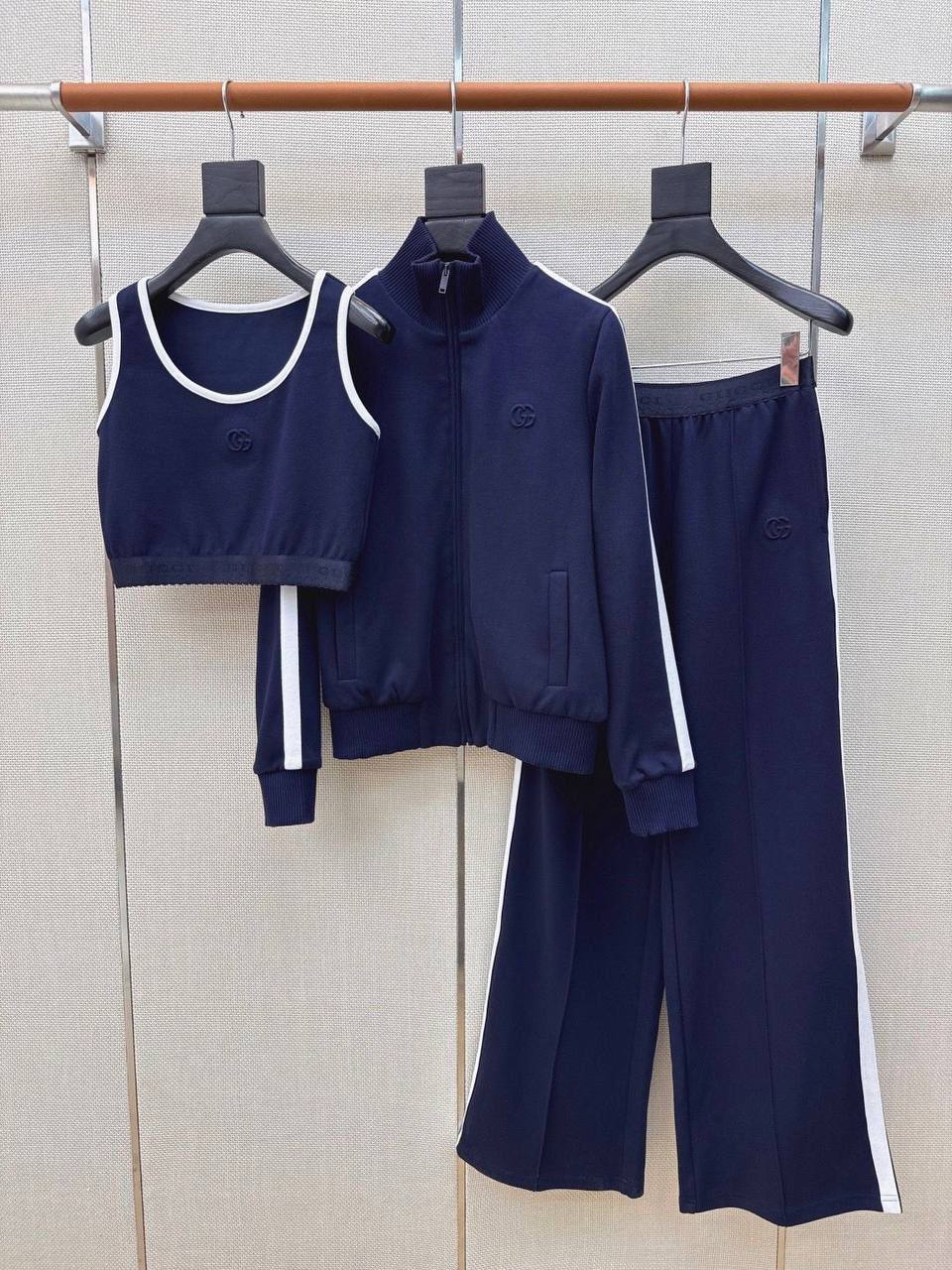 Спортивный костюм Gucci – это сочетание комфорта и узнаваемого стиля. Комплект, состоящий из топа, куртки на молнии и брюк, выполнен в темно-синем цвете с белыми акцентами. Отличный выбор для активного отдыха и создания стильного образа.