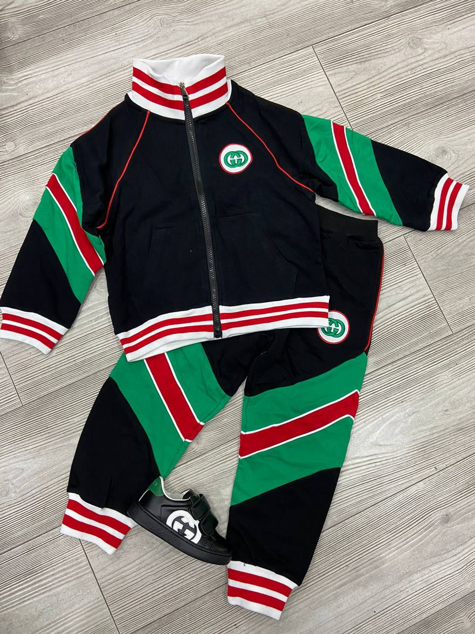 Спортивный костюм Gucci LUX-69118 – это стильный и комфортный комплект, идеально подходящий для активного образа жизни. Сочетание черного, зеленого и красного цветов создает яркий и запоминающийся дизайн. Костюм включает в себя куртку на молнии с воротником-стойкой и брюки, дополненные фирменным логотипом.