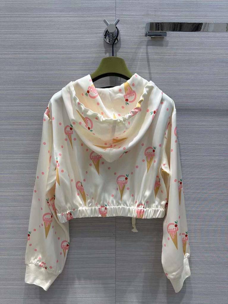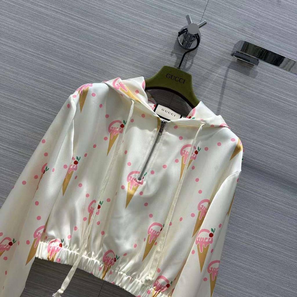 Костюм спортивный Gucci LUX-86269 — это стильный комплект от известного бренда, состоящий из куртки с капюшоном и шорт. Белый костюм украшен ярким принтом в виде мороженого и розовыми горошками, что придает ему игривый и летний вид. Идеально подойдет для повседневного использования и активного отдыха.