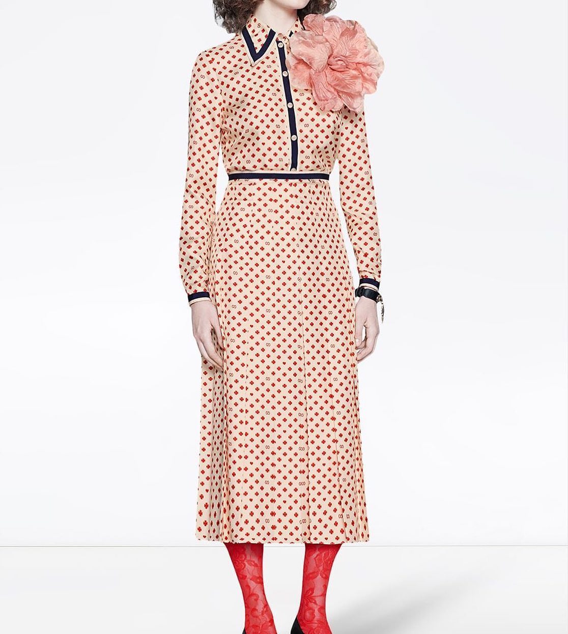 Представленный женский костюм Gucci LUX-31289 — это элегантное платье-рубашка с принтом, выполненное в стиле ретро. Дизайн отличается приталенным силуэтом, длинными рукавами и акцентным объемным цветком на плече, что придает образу утонченность и роскошь. Такой костюм идеально подойдет для особых случаев и выходов в свет, подчеркивая индивидуальность и безупречный вкус.