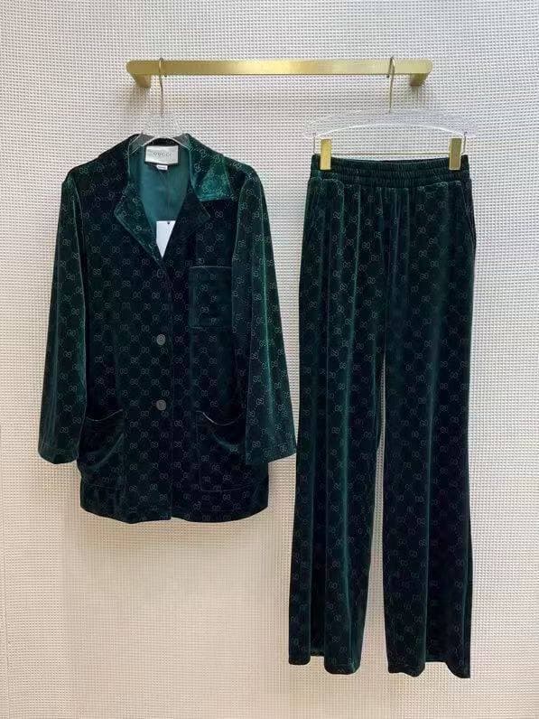 Этот женский костюм Gucci LUX-62232 представляет собой элегантный выбор в стиле casual, идеально подходящий для создания расслабленных, но стильных образов. Комплект выполнен в глубоком темно-зеленом цвете и украшен узнаваемым монограммным принтом Gucci, что придает ему роскошный вид.