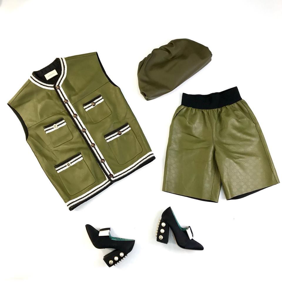 Этот женский костюм Gucci LUX-19970, состоящий из жилета и шорт, выполнен в трендовом оливковом цвете. Жилет отличается лаконичным дизайном с контрастной отделкой по краям и на накладных карманах, а шорты с высокой талией и эластичным поясом украшены тисненым брендовым узором. Комплект идеально подходит для создания стильных повседневных и вечерних образов.