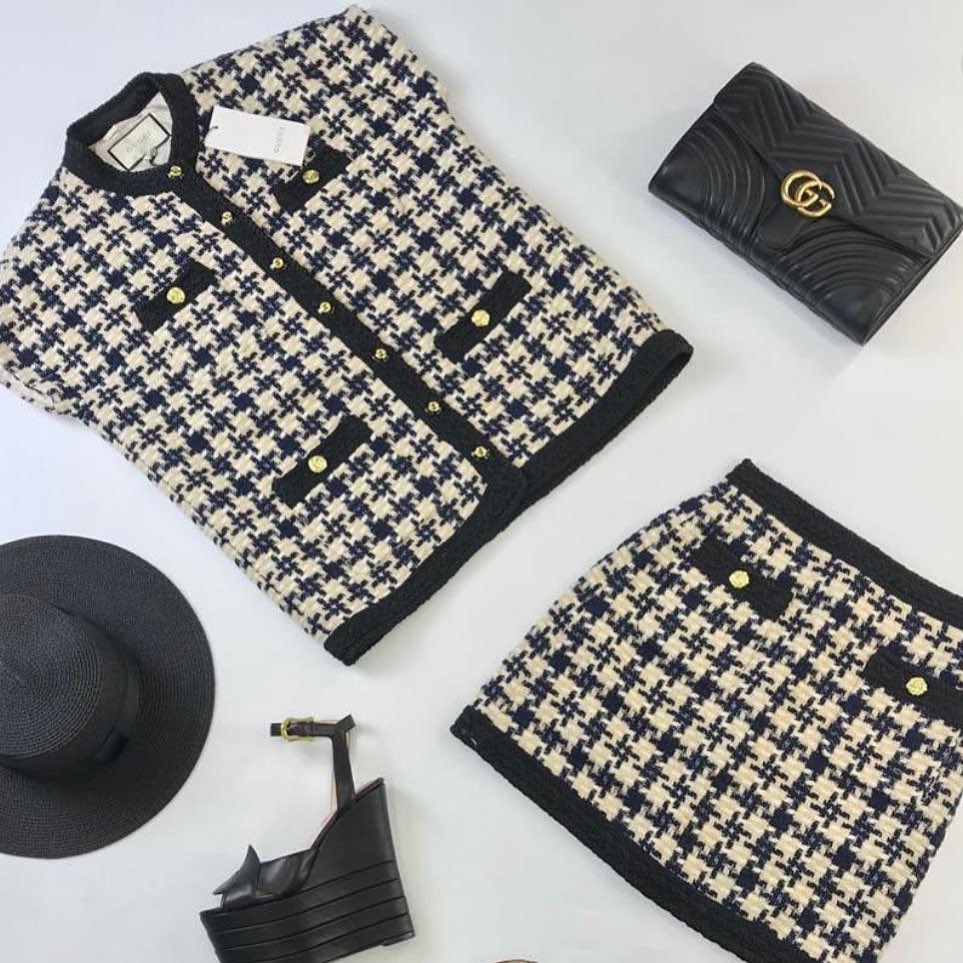 Этот женский костюм Gucci LUX-34736 представляет собой элегантный комплект, состоящий из жакета и юбки, выполненный в классическом стиле. Дизайн костюма подчеркнут характерным принтом "гусиная лапка" в сине-белой гамме, отделанным контрастным черным кантом и украшенным золотистыми пуговицами. Комплект идеально подходит для создания изысканных образов как для повседневной носки, так и для особых случаев.