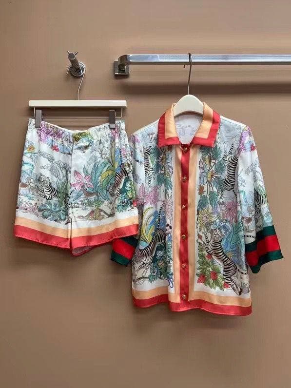 Представленный женский костюм Gucci LUX-63977 — это яркий комплект, состоящий из рубашки и шорт, выполненный в эклектичном стиле. Дизайн поражает детализацией: тропический лес с экзотическими растениями и хищниками, такими как тигры, создает ощущение роскоши и приключения. Контрастные полосы на манжетах и подоле шорт добавляют динамичности. Этот костюм станет акцентным элементом гардероба, подчеркивающим индивидуальность.