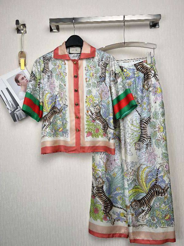 Этот женский костюм Gucci LUX-66485 представляет собой изысканный комплект, сочетающий в себе яркий дизайн и высокое качество. Костюм выполнен в стиле "casual chic", идеально подходящем для создания стильных образов как для повседневной носки, так и для особых случаев. Привлекательный принт с изображением тигров и тропических растений придает изделию неповторимый характер, а характерные для бренда полосы Gucci на рукавах добавляют узнаваемости.