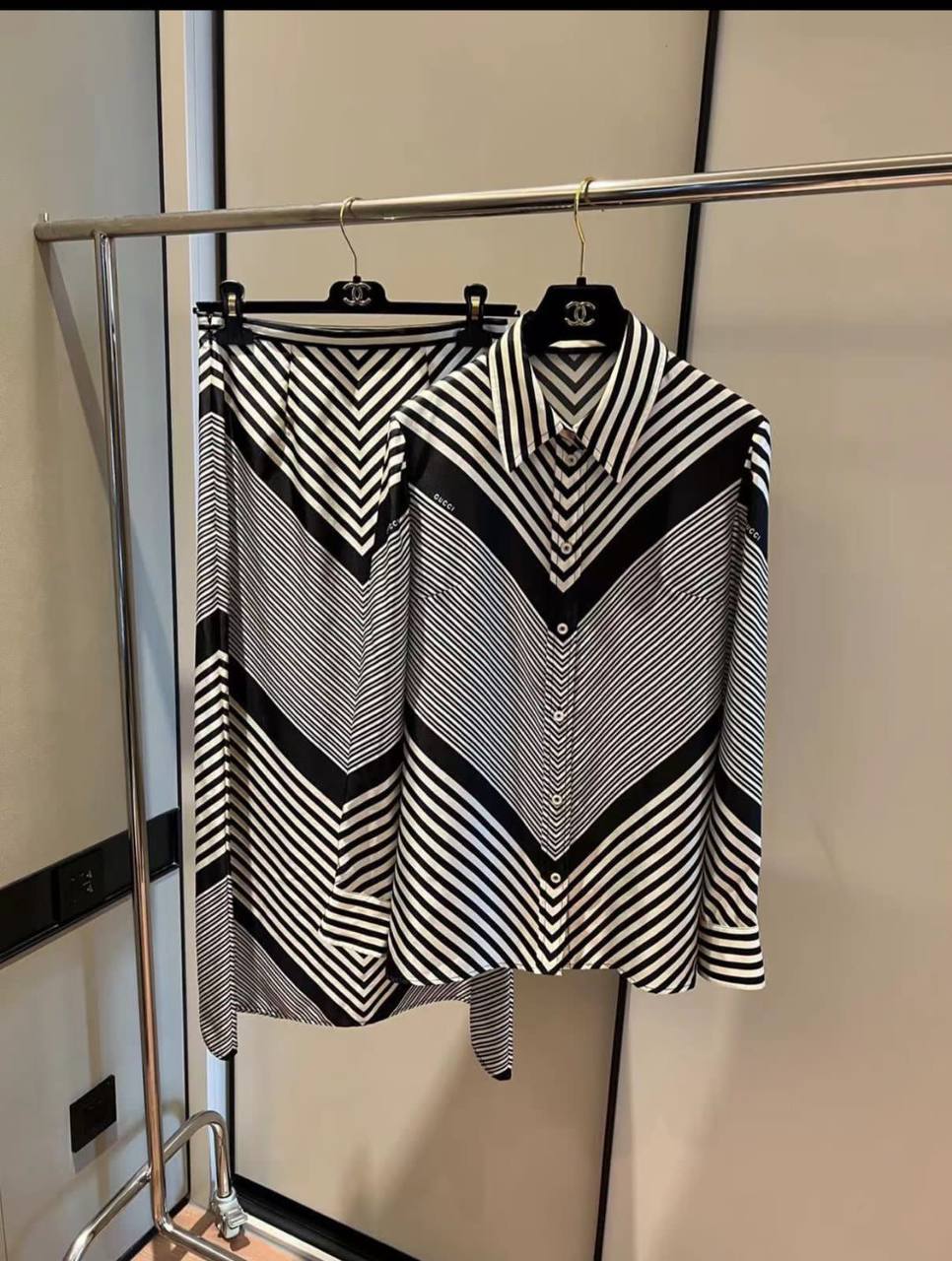 Представленный женский костюм Gucci LUX-66797 выполнен в современном и элегантном стиле. Комплект состоит из рубашки и юбки, объединенных эффектным черно-белым геометрическим принтом в виде зигзагов. Этот костюм идеально подойдет для создания изысканных образов как для повседневной носки, так и для особых случаев.