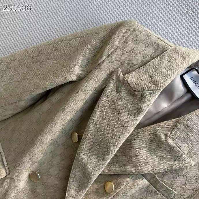 Костюм женский Gucci LUX-97033 – это стильный ансамбль в классическом стиле. Комплект состоит из двубортного пиджака и брюк прямого кроя. Костюм выполнен в песочном цвете с фирменным принтом бренда.