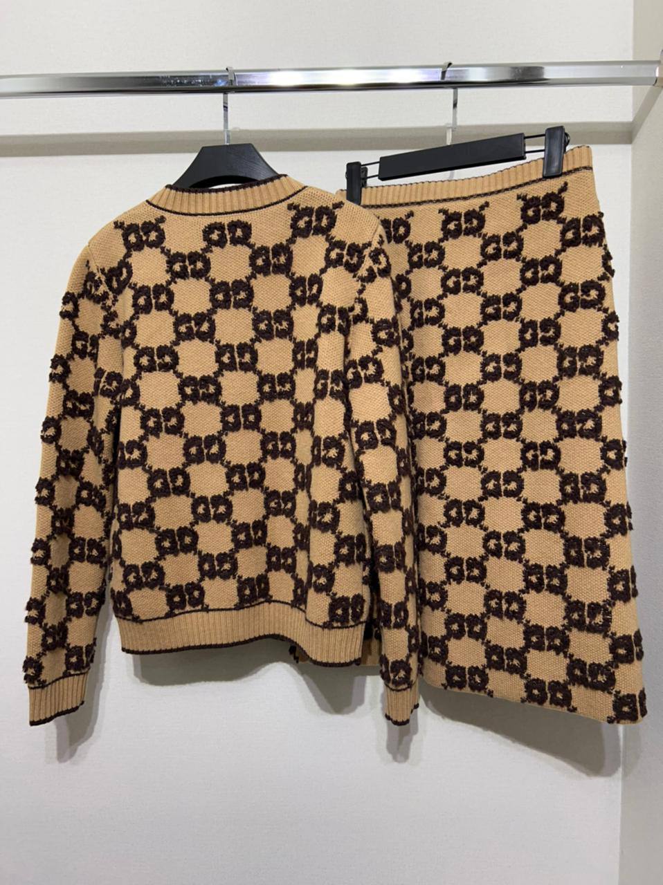 Женский костюм Gucci LUX-97747 – это элегантный ансамбль, который состоит из кардигана и юбки. Комплект выполнен в бежевом цвете с коричневым узором в виде логотипа бренда. Текстура ткани создает интересный визуальный эффект. Костюм подходит для создания стильных и запоминающихся образов.