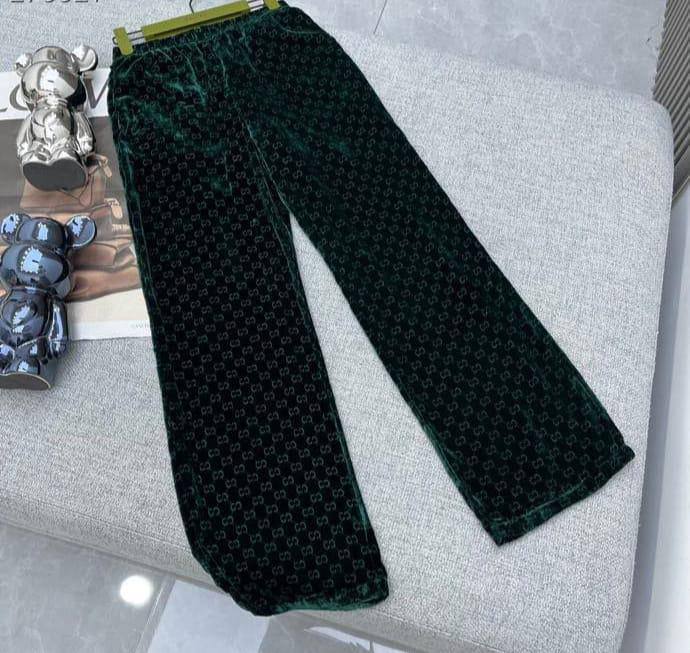 Костюм женский Gucci LUX-104396 представляет собой стильный элемент гардероба, выполненный в насыщенном зеленом цвете с характерным узором бренда. Мягкая текстура ткани, вероятно, создаёт ощущение комфорта и роскоши. Этот костюм идеально подходит для создания элегантного и расслабленного образа.
