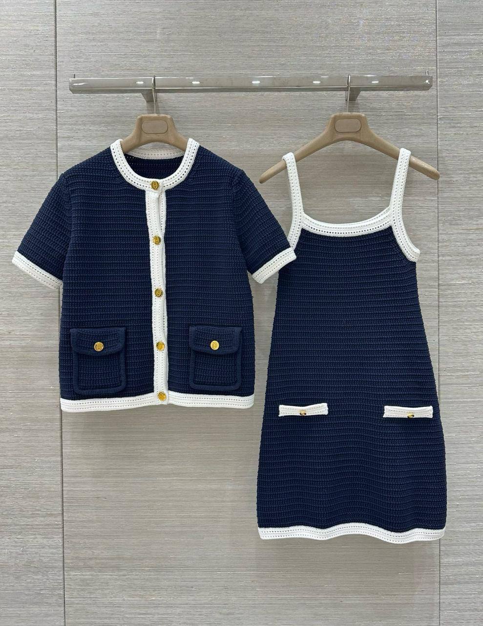Костюм женский Gucci LUX-117672 — это элегантный и стильный костюм для женщин. Он состоит из жакета с короткими рукавами и платья на бретельках. Костюм выполнен в темно-синем цвете с белыми деталями, создавая привлекательный контраст.