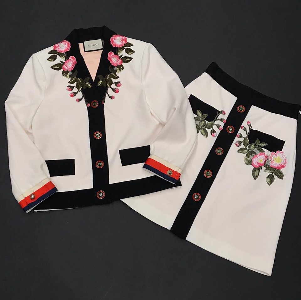 Костюм женский юбочный Gucci LUX-22025 представляет собой элегантный и изысканный наряд, сочетающий в себе классический крой и яркую вышивку. Этот костюм идеально подходит для создания стильных образов как для повседневной носки, так и для особых случаев. Дизайн костюма подчеркивает женственность и утонченность.
