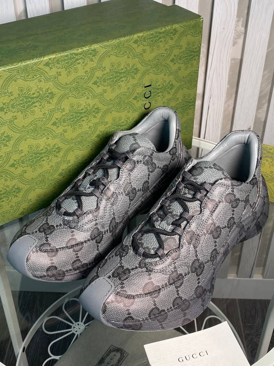 Кроссовки Gucci LUX-106540 — это стильные кроссовки от известного бренда. Они выполнены в сером цвете с узнаваемым узором по всей поверхности. Кроссовки имеют спортивный стиль и предназначены для повседневного ношения.