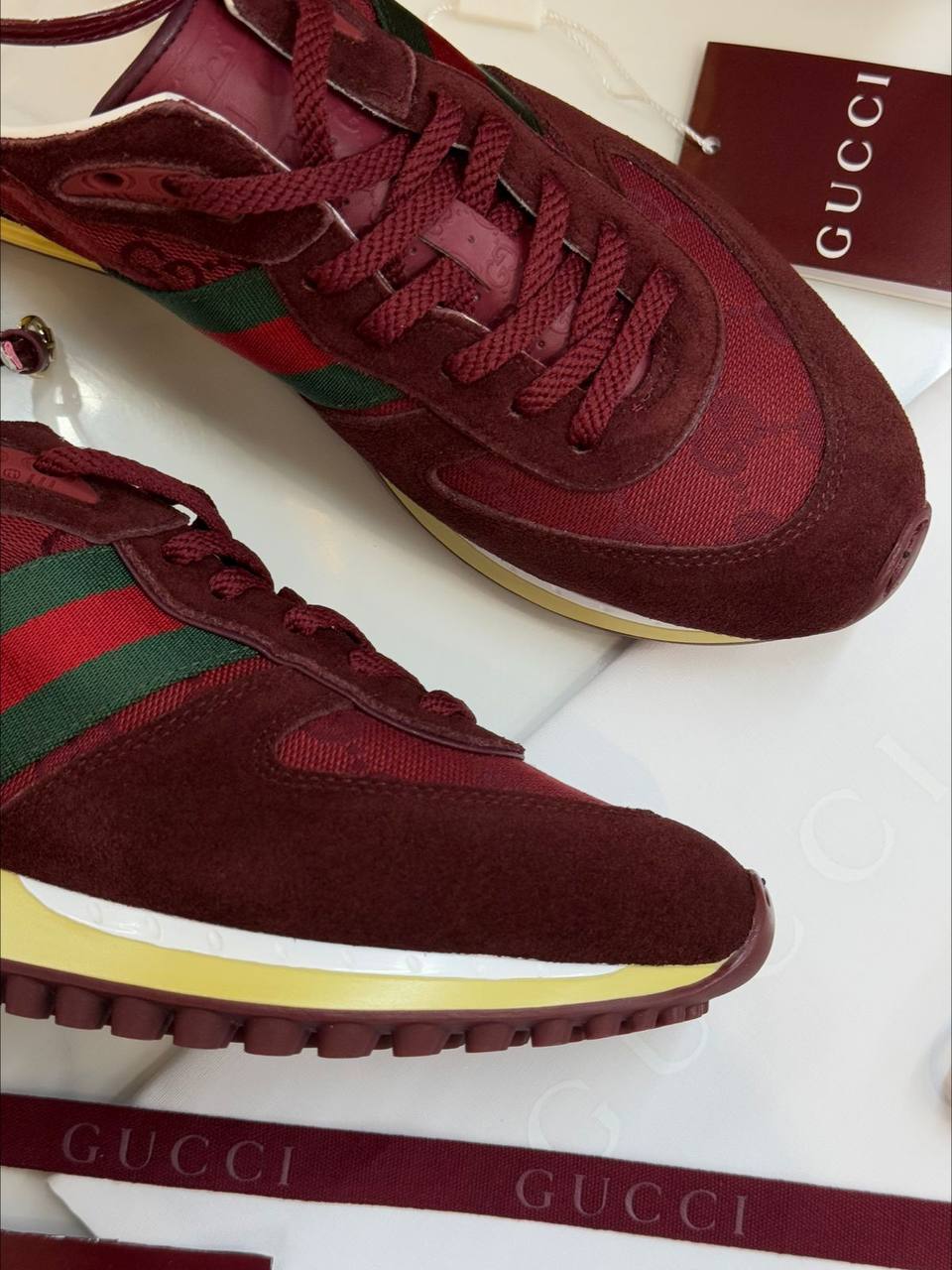 Кроссовки Gucci LUX-119110 – это стильная обувь, сочетающая в себе элегантность и спортивный стиль. Кроссовки выполнены в бордовом цвете с фирменной полоской Gucci. Они идеально подойдут для создания повседневных образов.