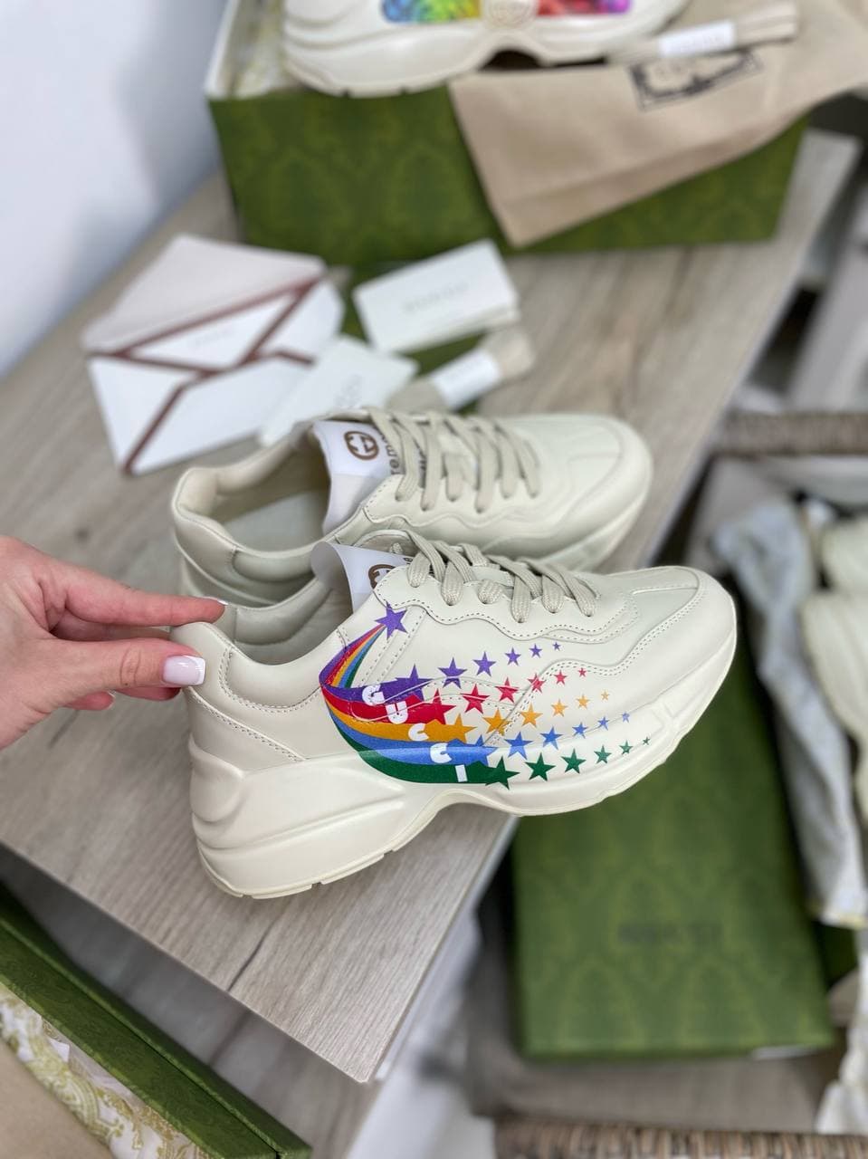 Женские кроссовки Gucci LUX-64379 – это стильная и яркая модель, выполненная в кремовом цвете. Дизайн украшен красочной аппликацией в виде радуги и звезд, что придает обуви оригинальный вид. Кроссовки идеально подойдут для повседневного ношения, обеспечивая комфорт и подчеркивая индивидуальность образа. Эта модель от Gucci станет прекрасным дополнением к вашему гардеробу.