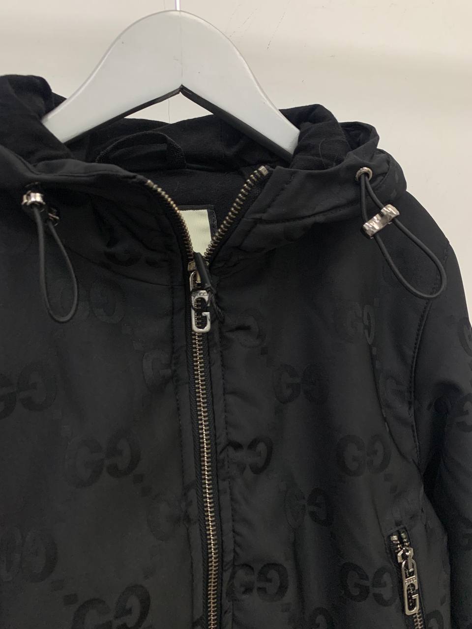 Куртка Gucci LUX-92682 выполнена в спортивном стиле с акцентом на узнаваемый логотип бренда. Куртка черного цвета, декорирована объемным принтом логотипов и дополнена контрастными белыми полосами на манжетах и нижней кромке. Идеально подходит для повседневной носки, обеспечивая комфорт и узнаваемый стиль.