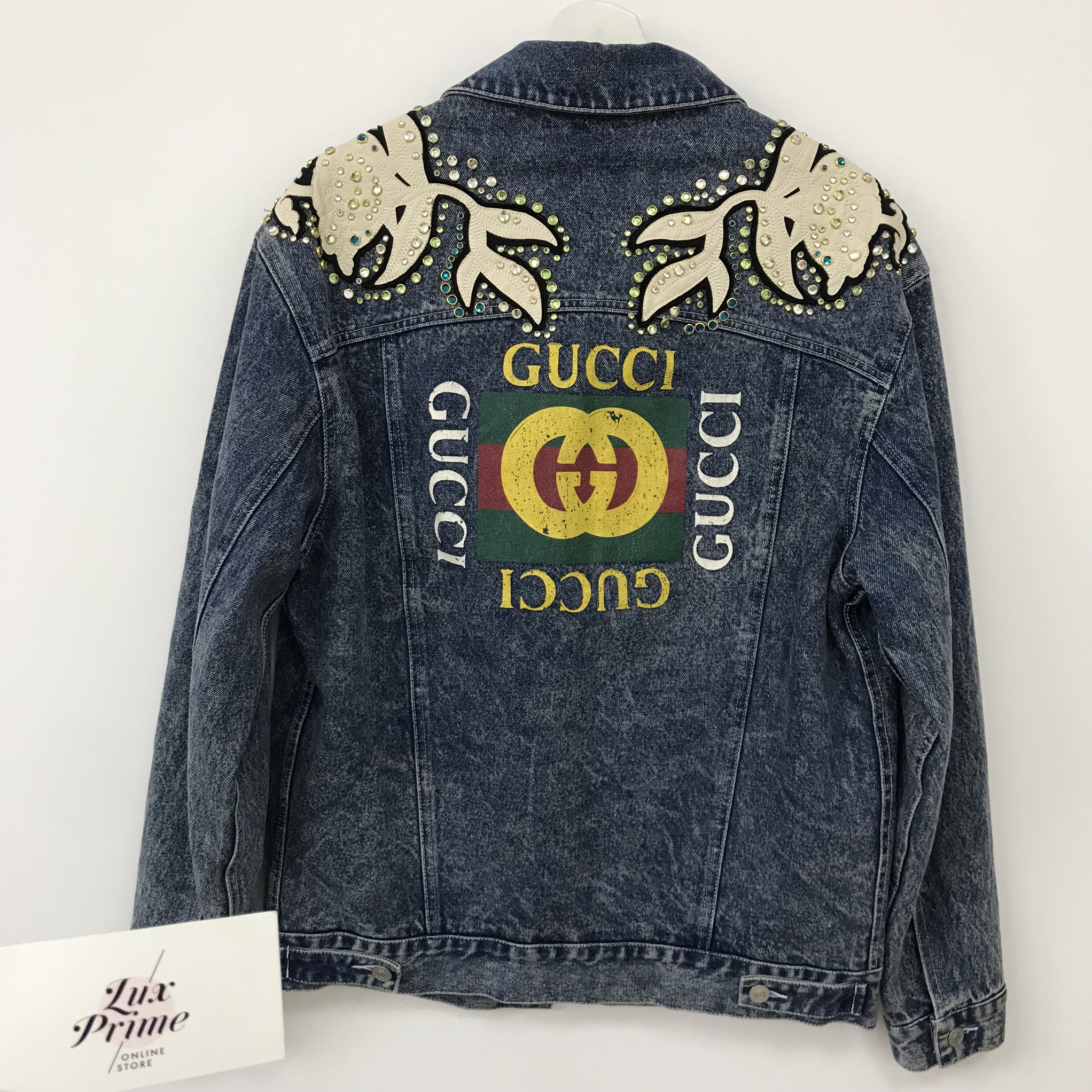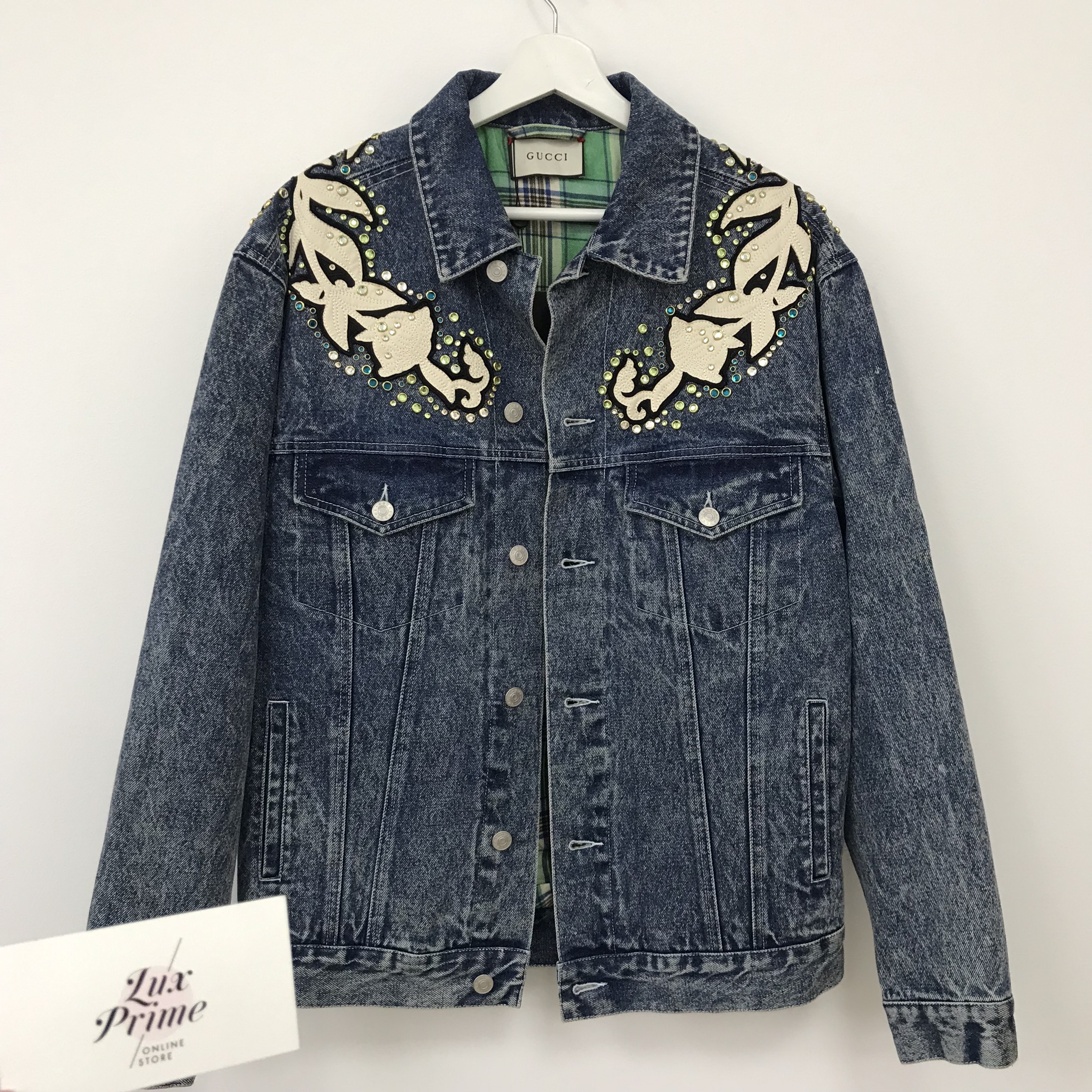 Женская джинсовая куртка Gucci LUX-17813 – это стильная и эффектная модель, сочетающая классический деним с яркими деталями. Куртка выполнена в синем цвете с винтажным эффектом. Оригинальные аппликации в виде листьев, украшенные сверкающими стразами и камнями, придают изделию эксклюзивный вид. Подкладка в клетку добавляет уюта и завершает образ.