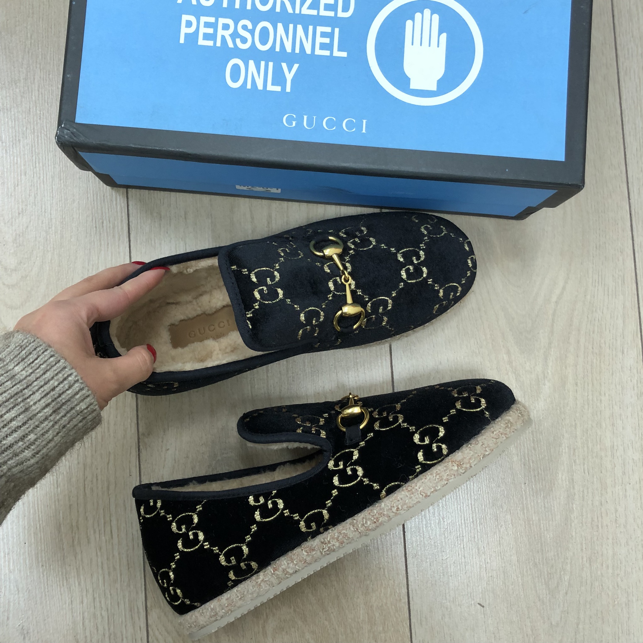 Эти роскошные женские лоферы Gucci LUX-21938 сочетают в себе классический дизайн и узнаваемый стиль бренда. Черный велюровый верх с золотистым принтом GG и меховая подкладка создают элегантный и уютный образ. Декоративная золотистая пряжка Horsebit придает лоферам узнаваемый шарм Gucci.
