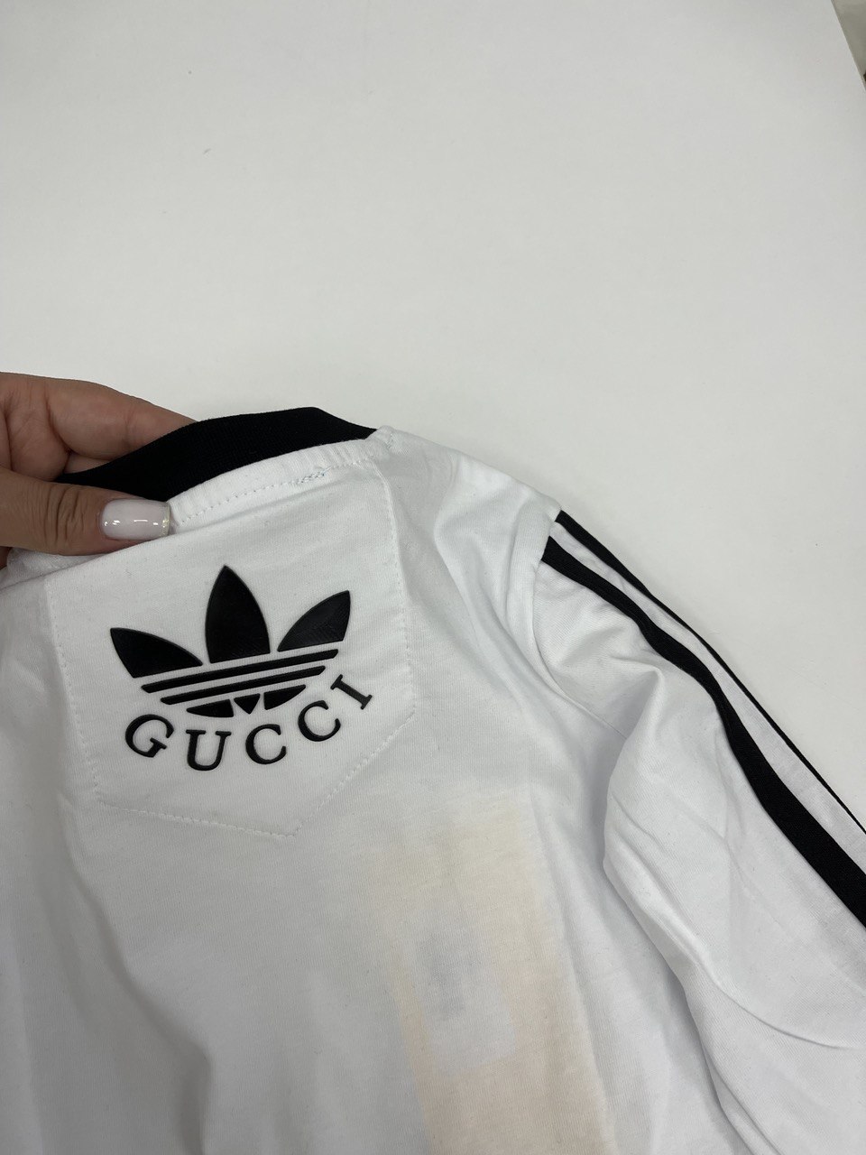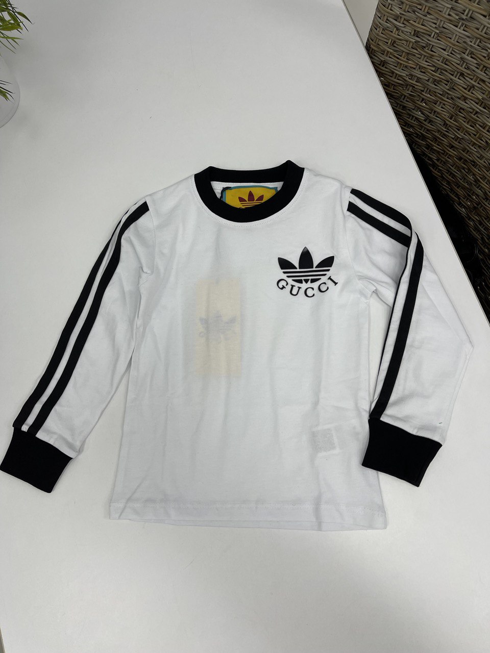 Лонгслив Gucci LUX-93802 выполнен в спортивном стиле. Основной цвет лонгслива — белый, с черными полосами на рукавах и манжетах. На груди расположен логотип бренда.