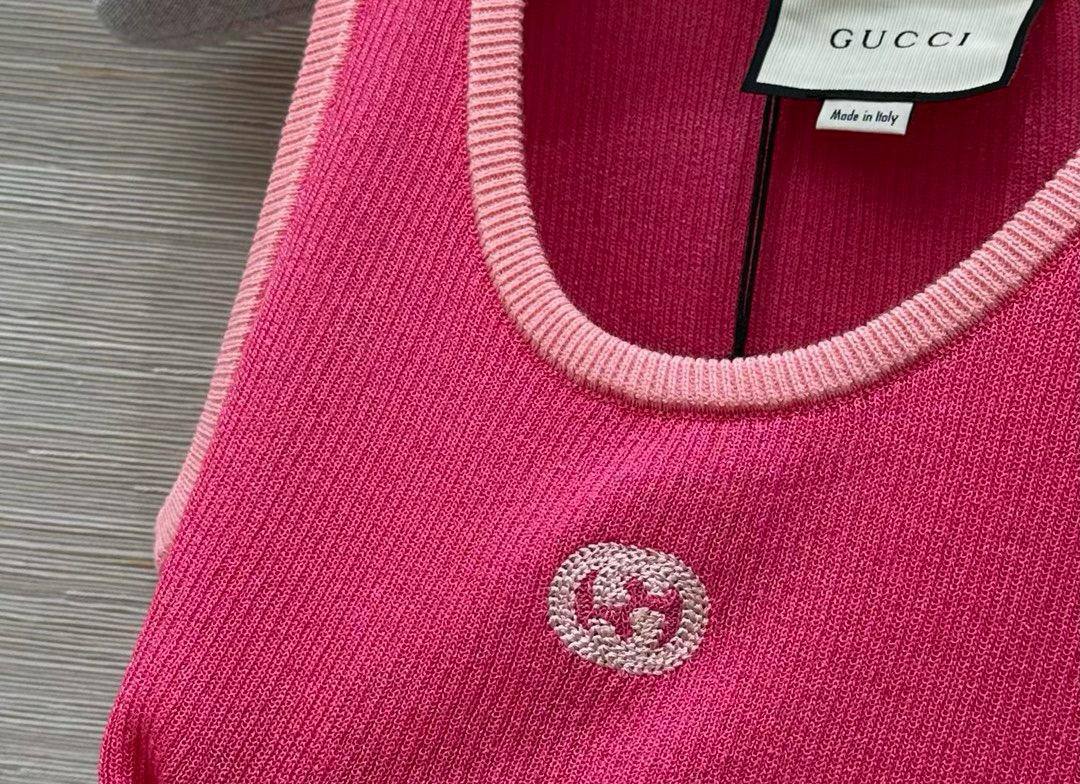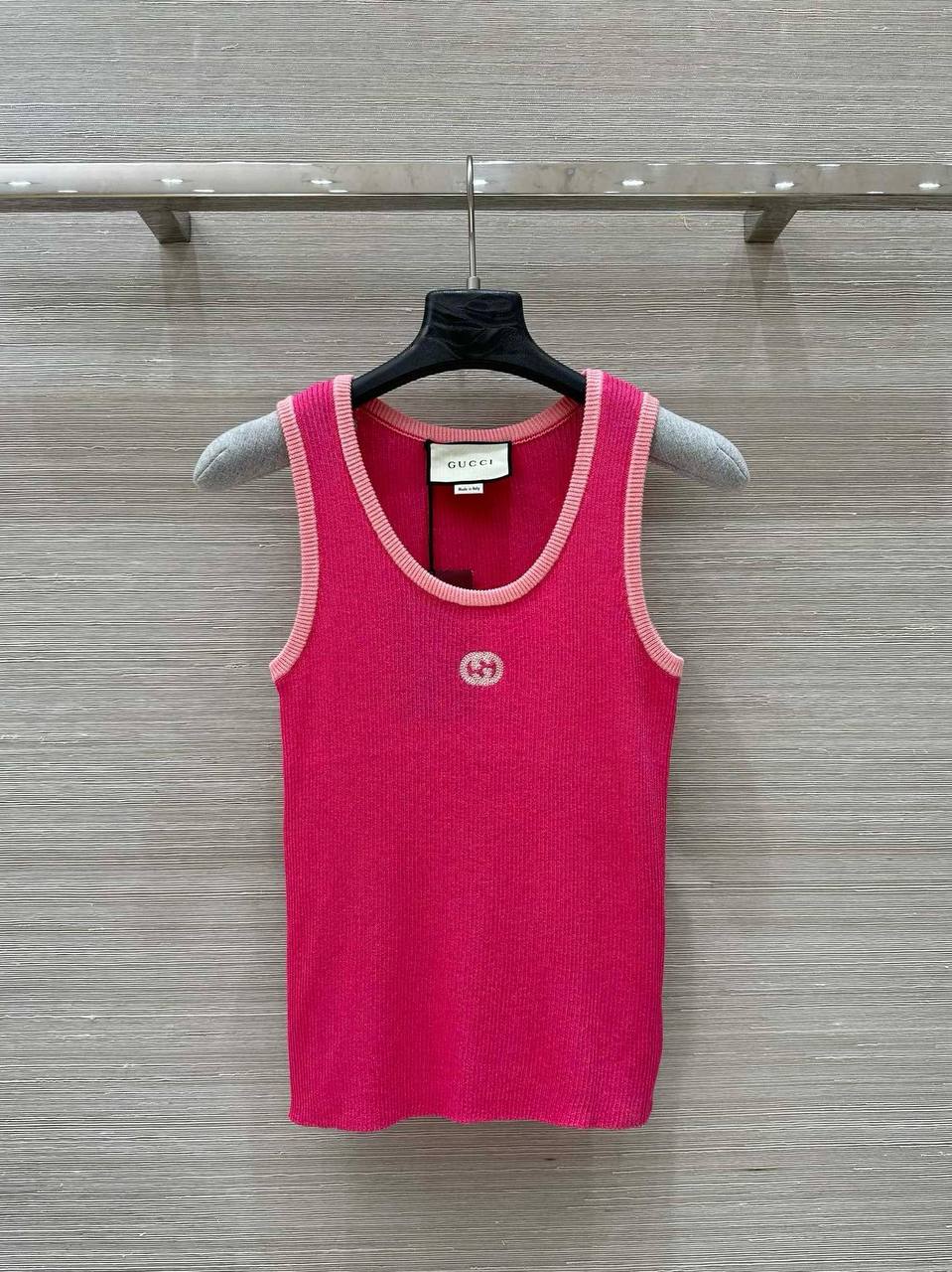 Майка Gucci LUX-115991 – воплощение элегантности и стиля. Розовая майка с круглым вырезом и контрастной отделкой, подчеркивающей силуэт, идеально подойдет для создания стильного образа. Классический фасон майки дополнен небольшим логотипом бренда спереди.