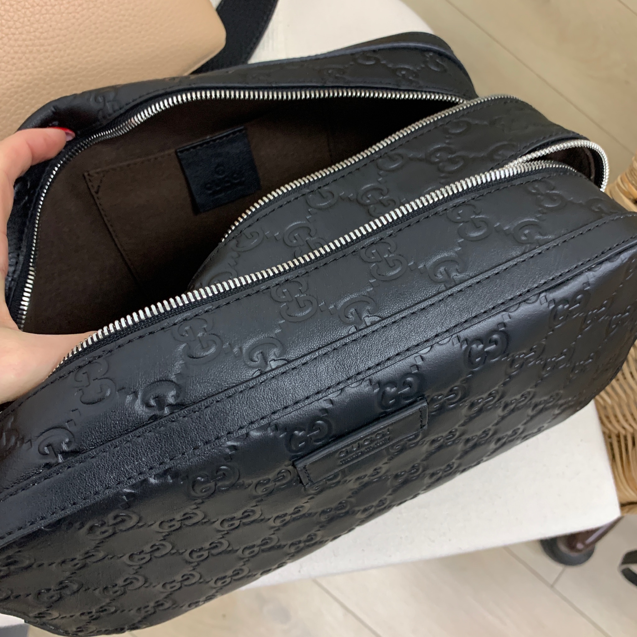Несессер Gucci LUX-25634 — это стильный и практичный аксессуар, выполненный в классическом черном цвете. Его дизайн отличается тисненым узором с узнаваемым логотипом бренда, что придает изделию роскошный вид. Аккуратные линии и внимание к деталям подчеркивают высокое качество изготовления. Этот несессер идеально подходит для хранения косметики, туалетных принадлежностей или других мелких предметов, обеспечивая порядок и легкий доступ.