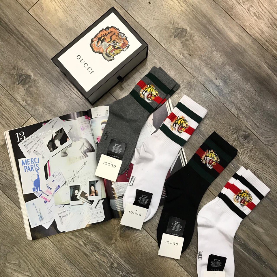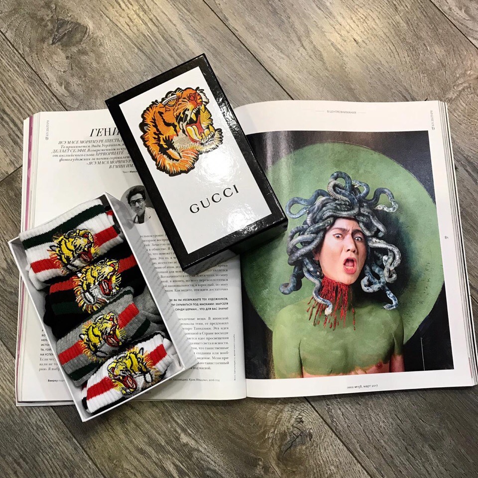 Носки Gucci АКС-316 представляют собой стильный и яркий аксессуар, который дополнит как повседневный, так и спортивный образ. На каждом носке изображен узнаваемый тигр Gucci, окруженный зелеными и красными полосами, что придает им узнаваемый дизайнерский вид.