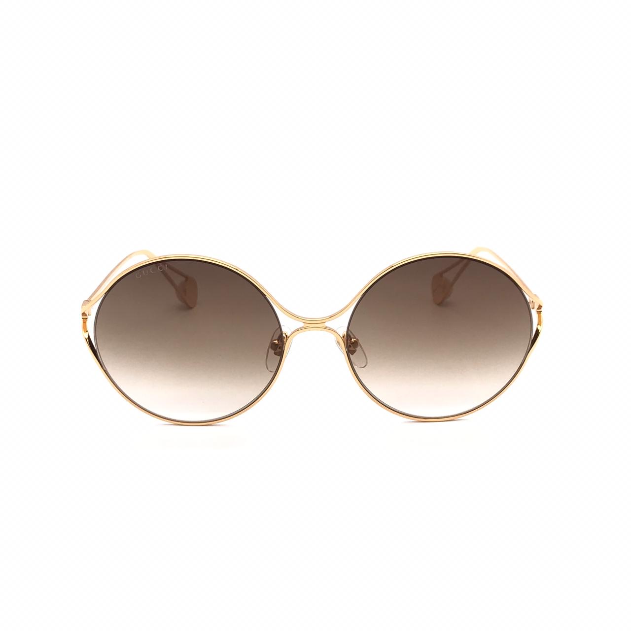Эти очки Gucci LUX-25775 выполнены в элегантном и изысканном стиле, идеально дополняющем модный женский образ. Их круглая форма и золотистый металлический ободок придают утонченности, а градиентные коричневые линзы обеспечивают стильную защиту от солнца.