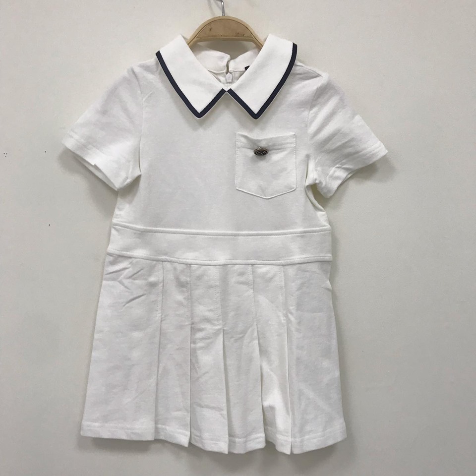 Это очаровательное детское платье Gucci LUX-15027 выполнено в классическом стиле с акцентом на комфорт и элегантность. Белый цвет платья с контрастным темно-синим кантом на воротнике придает ему изысканный вид. Складки на юбке и аккуратный нагрудный карман с декоративной пуговицей дополняют образ, делая его подходящим как для повседневной носки, так и для особых случаев.