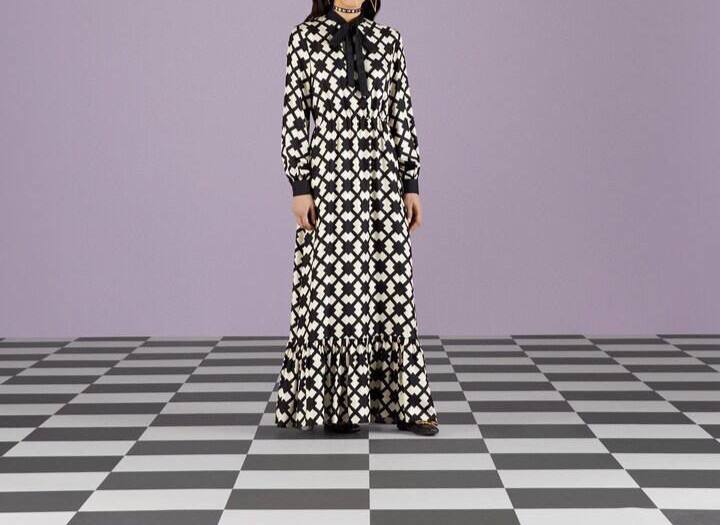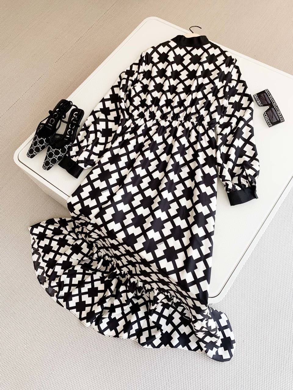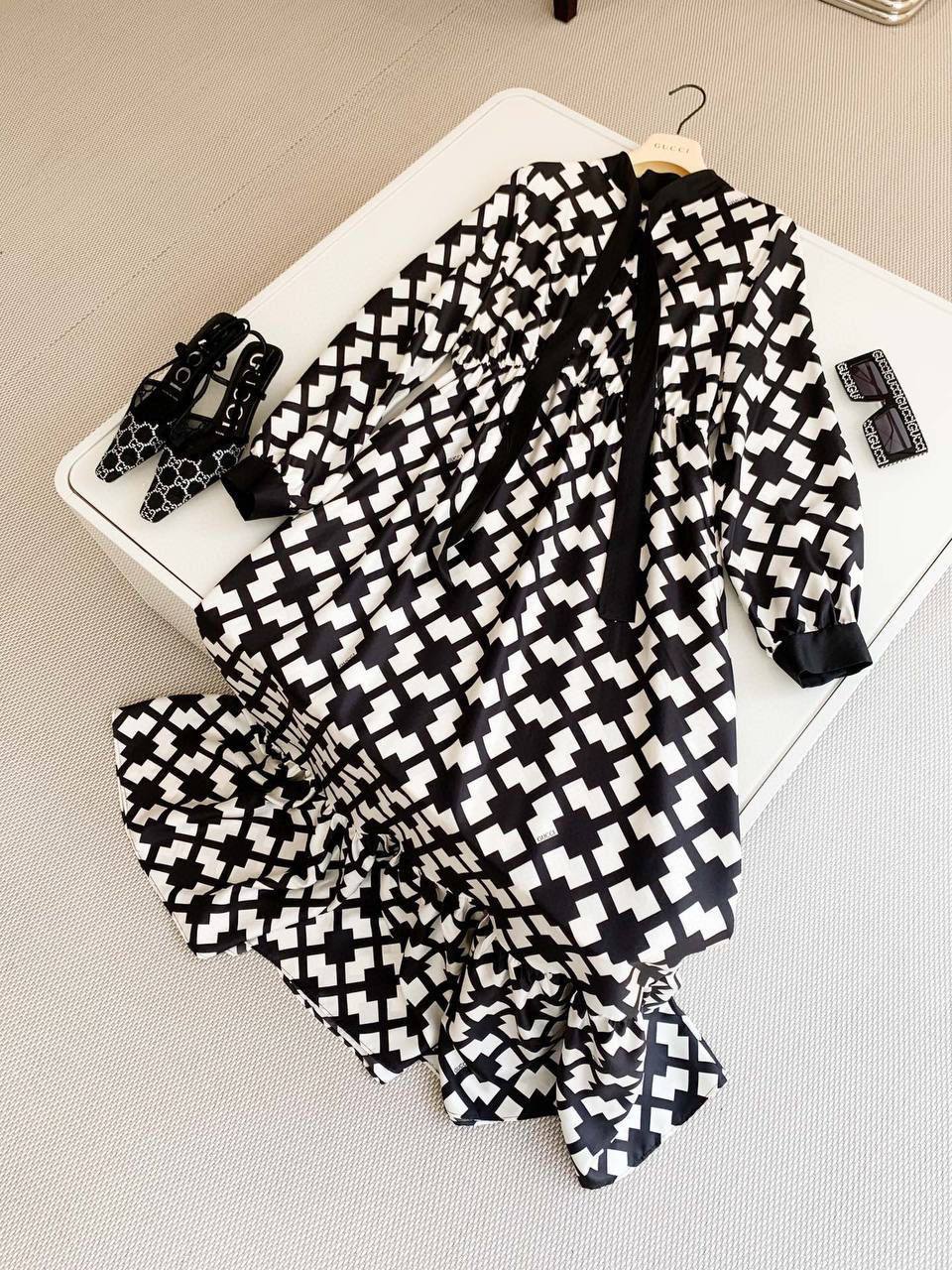 Платье Gucci LUX-87181 представляет собой изысканное сочетание стиля и элегантности, характерное для бренда Gucci. Платье выполнено в черно-белой цветовой гамме с геометрическим узором. Его дизайн подойдет как для повседневной носки, так и для особых случаев.
