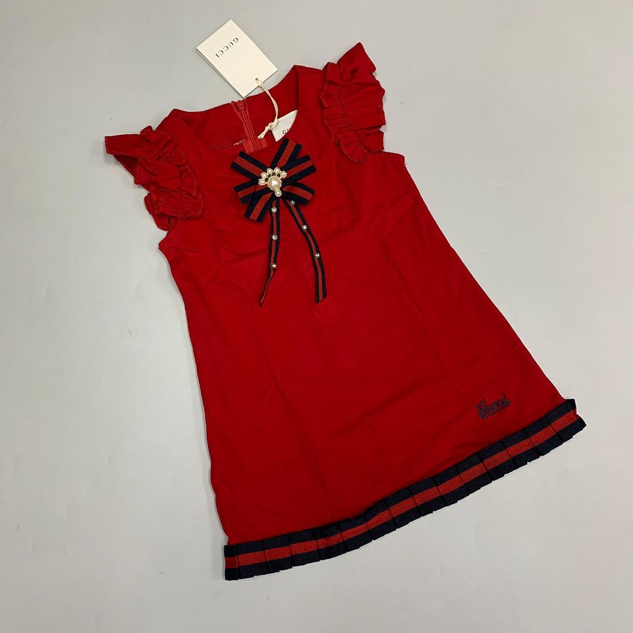 Это яркое красное платье Gucci LUX-33150 — идеальный выбор для маленькой модницы, желающей выглядеть стильно и элегантно. Дизайн сочетает в себе классический крой с очаровательными деталями, такими как объемный бант с жемчужной бусиной и рюшами на рукавах, создавая праздничное и нарядное настроение.
