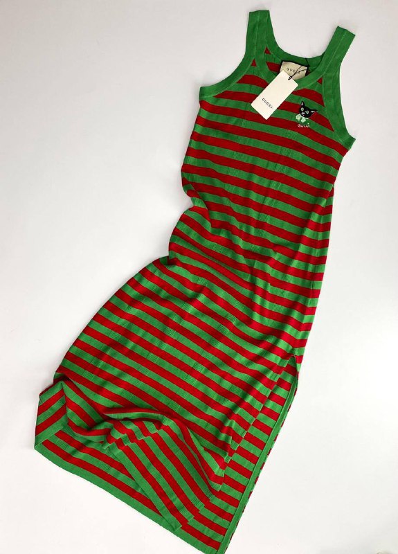 Платье Gucci LUX-50707 — это стильное и яркое решение для создания эффектных образов. Это трикотажное платье в полоску, выполненное в красно-зеленой гамме, отличается оригинальным дизайном. Эмблема с изображением кота придает модели игривый и запоминающийся вид, делая его идеальным выбором для тех, кто ценит индивидуальность в одежде.