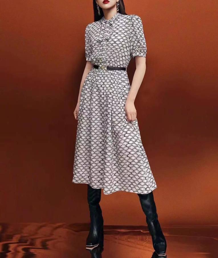 Элегантное платье Celine LUX-66757 в стиле кэжуал-шик, украшенное мелким монохромным принтом. Приталенный силуэт и расклешенная юбка миди создают женственный образ. Модель дополнена воротником-стойкой и бантом, что придает платью особый шарм. Идеально подходит для создания утонченных повседневных и вечерних образов.