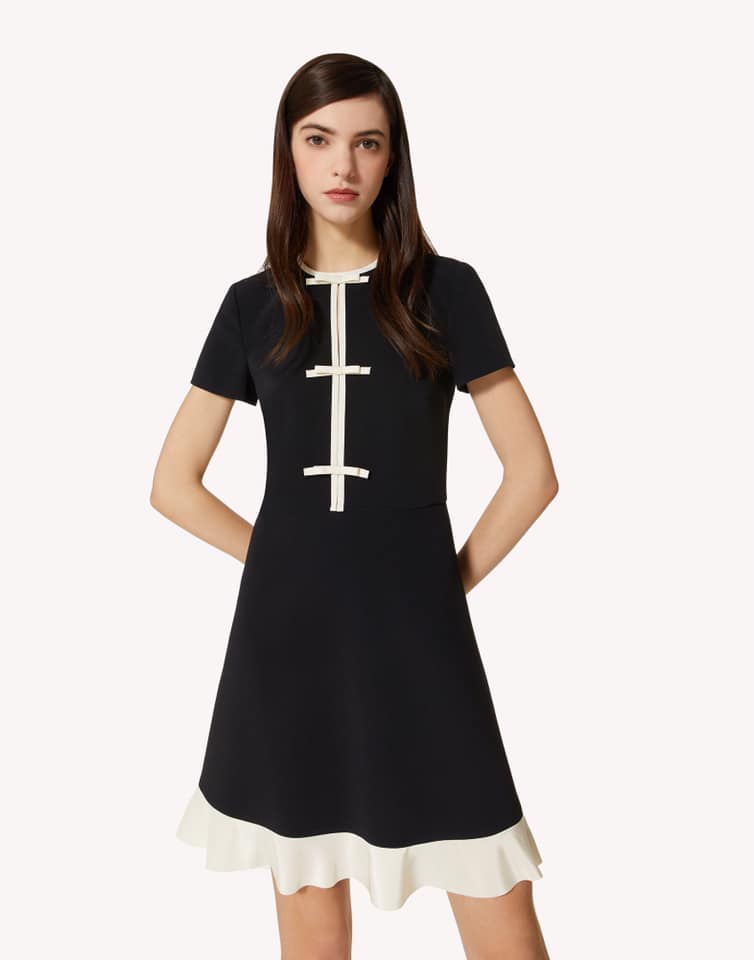 Это элегантное платье Gucci LUX-48008 выполнено в классическом черном цвете с контрастными белыми декоративными элементами, напоминающими бантики. А-силуэт и короткие рукава создают женственный и утонченный образ, идеально подходящий для особых случаев или стильных повседневных выходов.