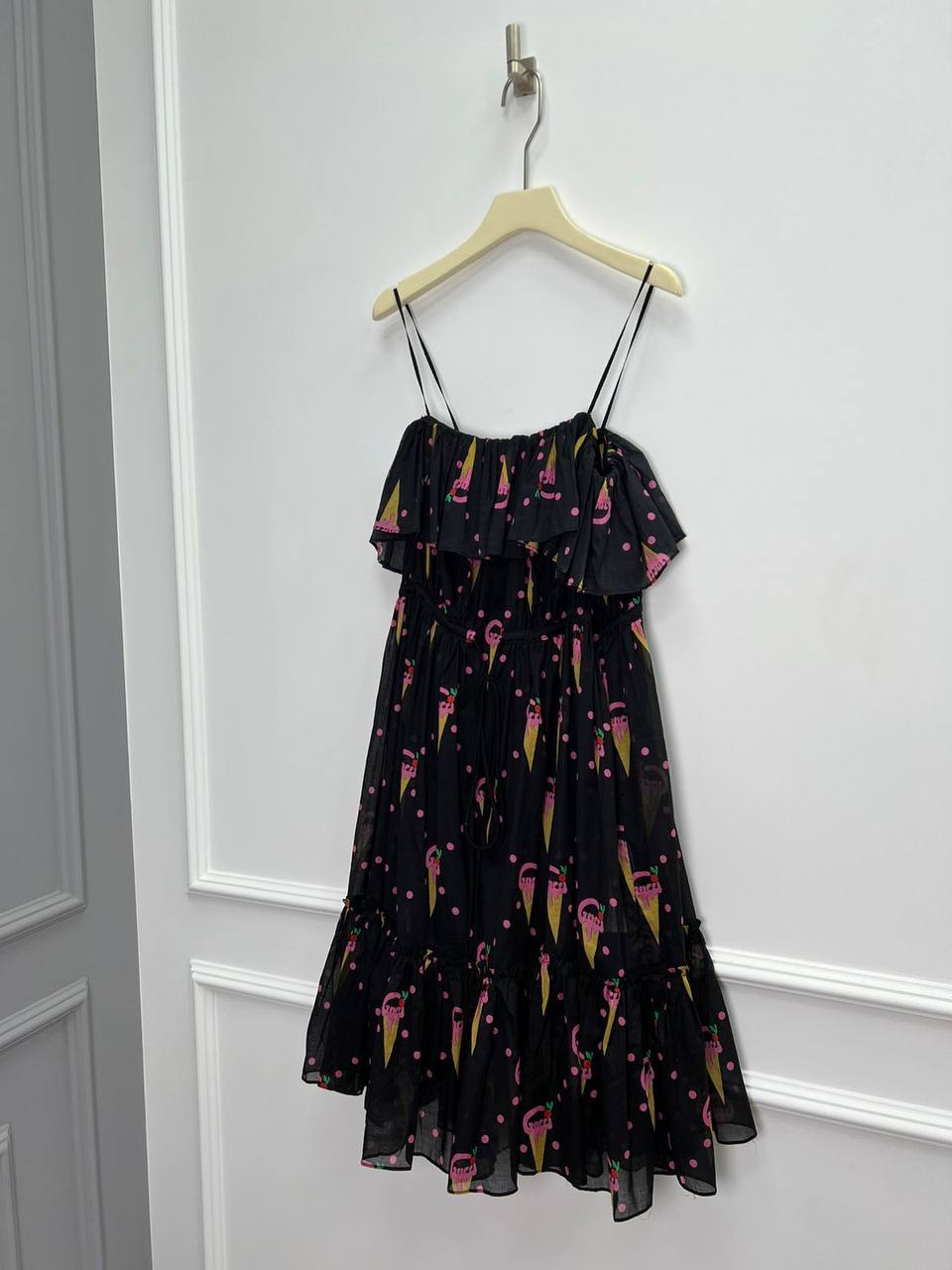 Платье Gucci LUX-88411 - это летнее платье на тонких бретелях, выполненное в игривом стиле. Черный цвет платья дополнен ярким принтом в виде мороженого и розовыми горошками. Легкая текстура ткани обеспечивает комфорт в жаркую погоду, а свободный крой подойдет для различных мероприятий.