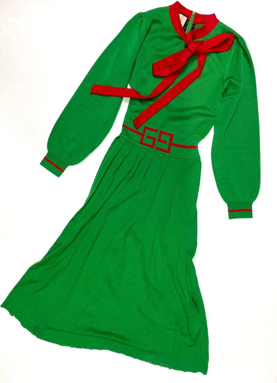 Представляем яркое и элегантное платье Gucci LUX-62940, выполненное в насыщенном зеленом цвете с контрастными красными акцентами. Это платье идеально сочетает в себе классический стиль и современный дизайн. Оно украшено объемным бантом на горловине и поясом с фирменным логотипом, подчеркивающим талию, а юбка плиссе добавляет образу утонченности.