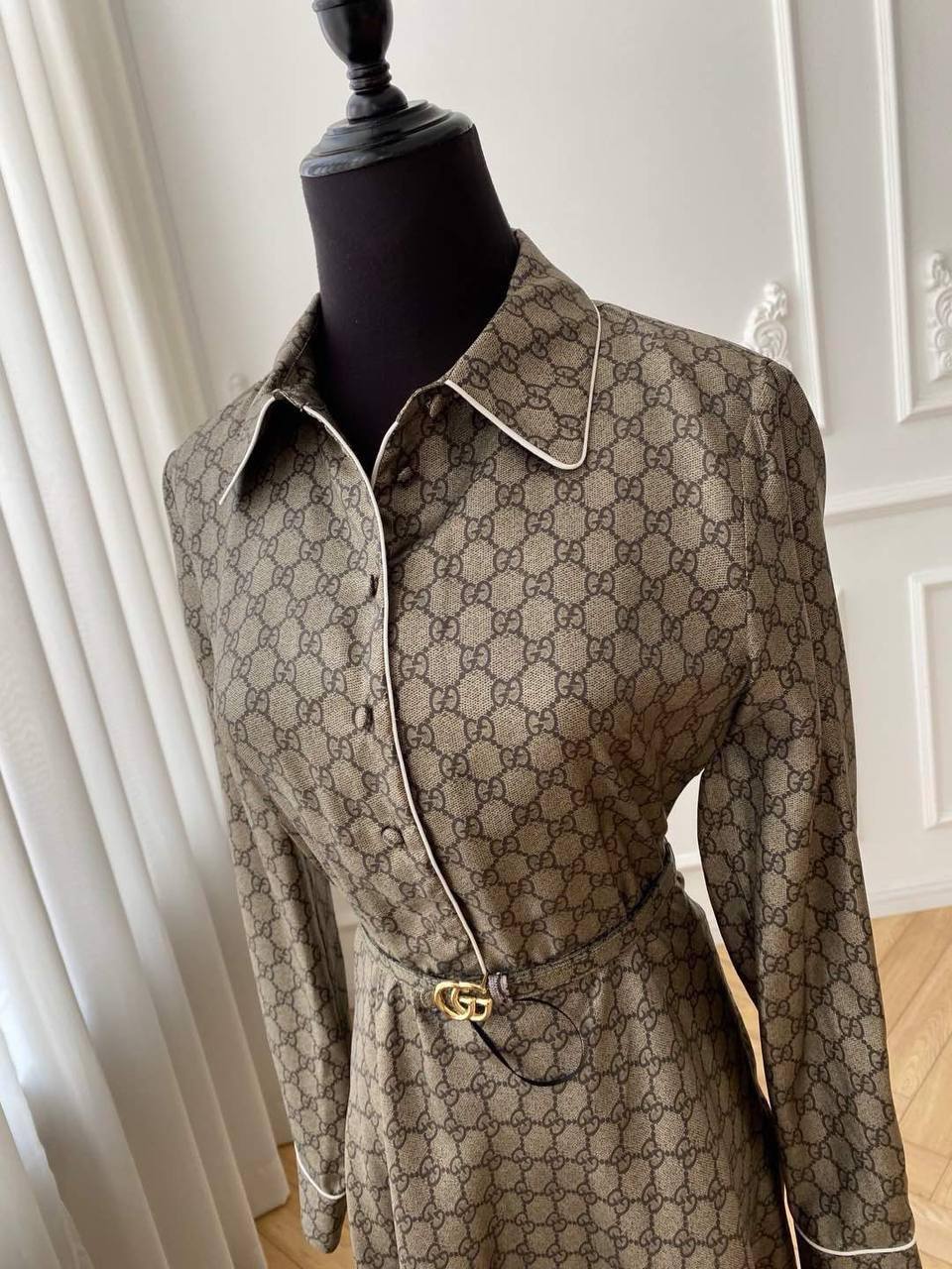 Платье Gucci LUX-113897 представляет собой элегантное платье рубашечного кроя. Основной цвет платья – коричневый, с узнаваемым узором логотипа бренда. Модель дополнена тонким ремнем, подчеркивающим талию, и контрастной отделкой по краям воротника и манжет.