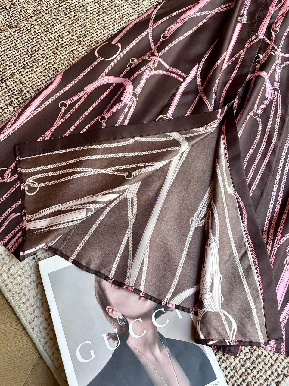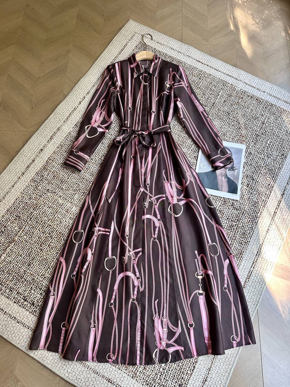 Платье Gucci LUX-132453 – элегантное и стильное решение для создания женственного образа. Платье с принтом в виде ремней и фурнитуры придаёт оригинальности.