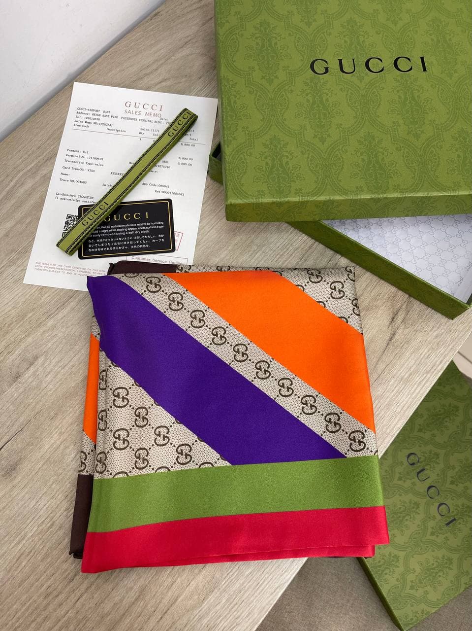 Элегантный платок Gucci LUX-63077 — это стильный аксессуар, который добавит ярких красок в ваш образ. Сочетание классического узора GG Supreme с яркими диагональными полосами делает этот платок узнаваемым и модным. Он идеально подходит для тех, кто ценит изысканность и оригинальность в каждой детали.