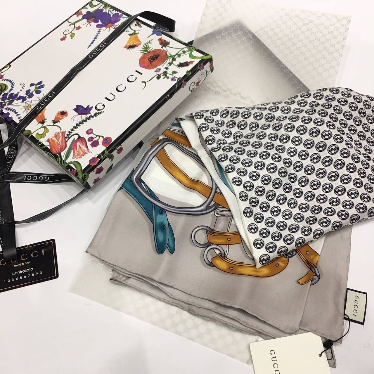 Шелковый платок Gucci LUX-64059 – это элегантный аксессуар, который добавит изысканности любому образу. Этот платок, выполненный в классическом стиле Gucci, украшен уникальным принтом, вдохновленным конным спортом, с изображением ремешков и пряжек. Его можно носить как шейный платок, повязать на сумку или использовать как элемент прически.