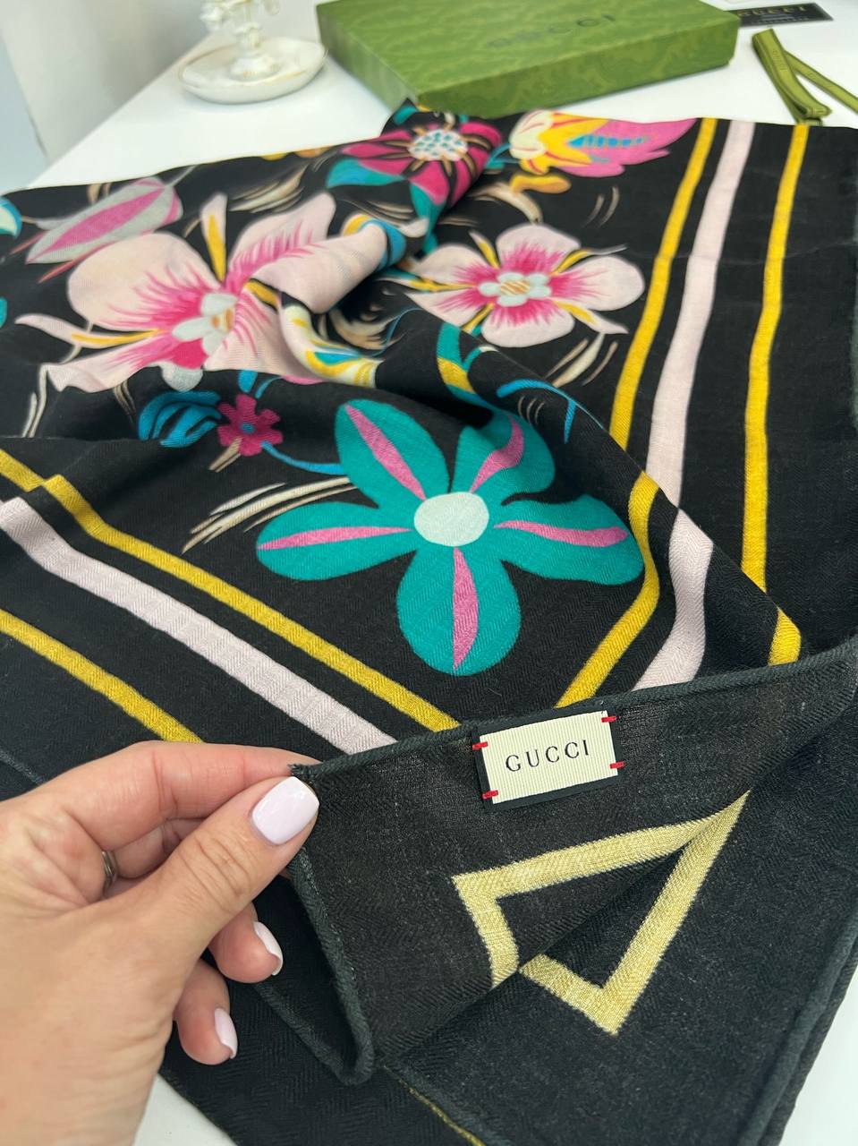 Платок Gucci LUX-96442 — это стильный аксессуар, который сочетает в себе элегантность и яркий дизайн. Этот платок выполнен в классическом стиле, с цветочным принтом на черном фоне. Текстура ткани мягкая и приятная на ощупь, что делает его идеальным для различных образов.