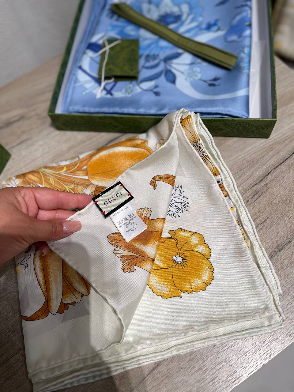 Платок Gucci LUX-122241 - это элегантный аксессуар, который добавит изысканности в любой образ. Изысканный дизайн с флористическими мотивами и логотипом бренда делает этот платок узнаваемым и желанным.