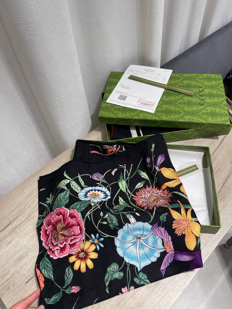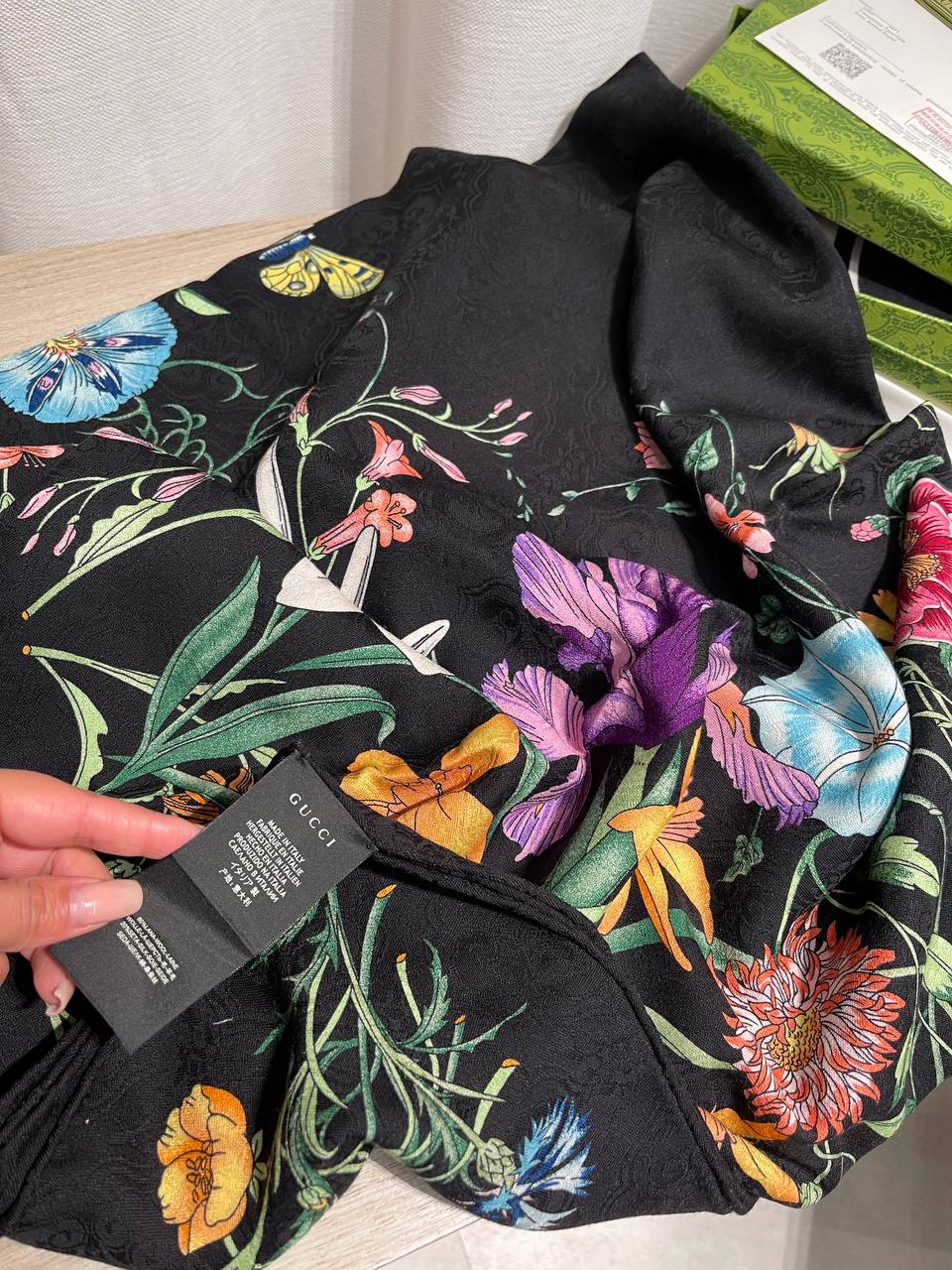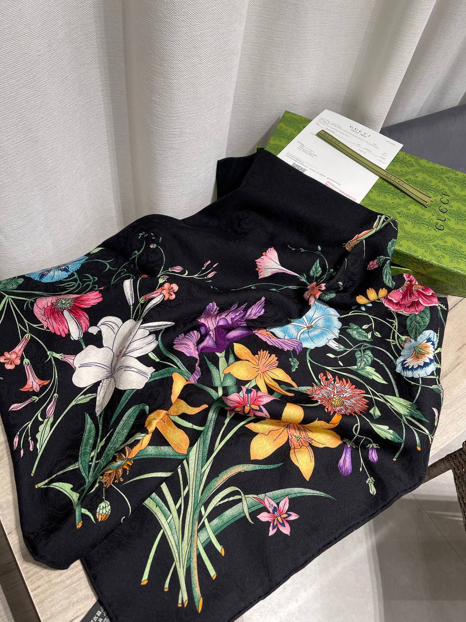 Элегантный платок Gucci LUX-122916 – это аксессуар, который добавит изысканности и утонченности любому образу. Его яркий цветочный принт на темном фоне выглядит стильно и современно.