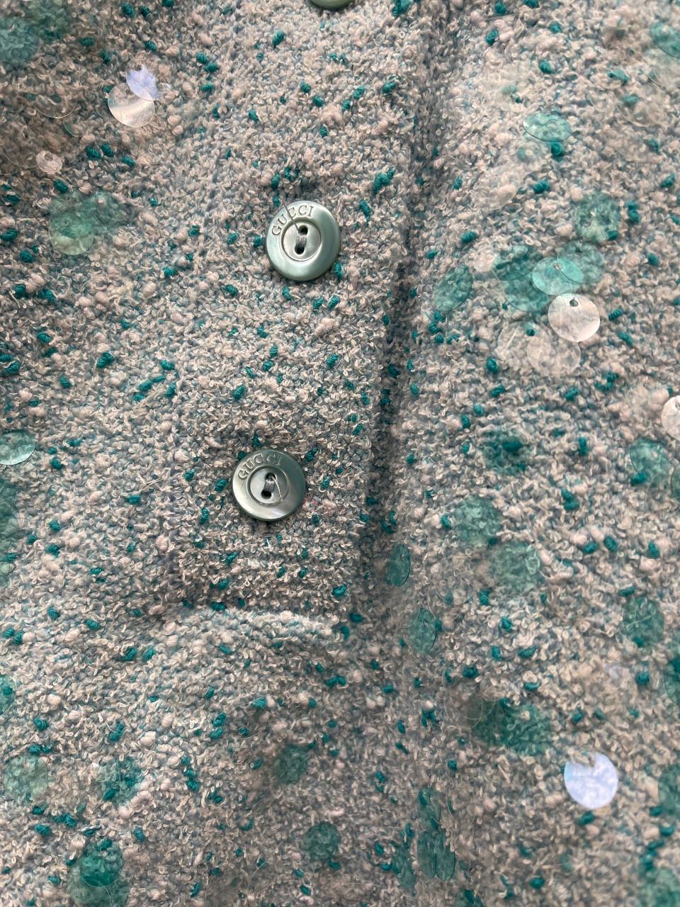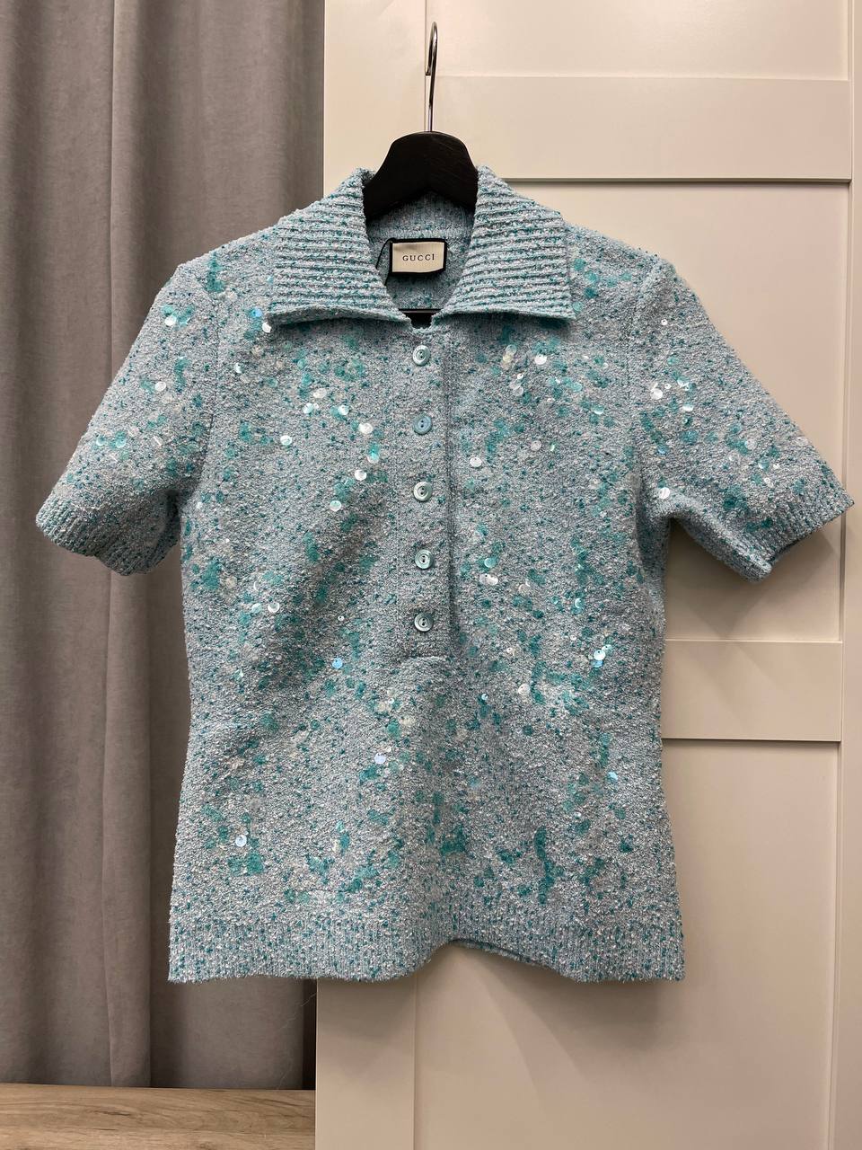 Поло Gucci LUX-115477 - это стильное поло бирюзового цвета, украшенное пайетками, которое сочетает в себе роскошь и современный дизайн. Этот предмет гардероба идеально подойдет для создания элегантных и запоминающихся образов. Поло можно носить как на повседневные мероприятия, так и на особые случаи, подчеркивая индивидуальность и стиль.