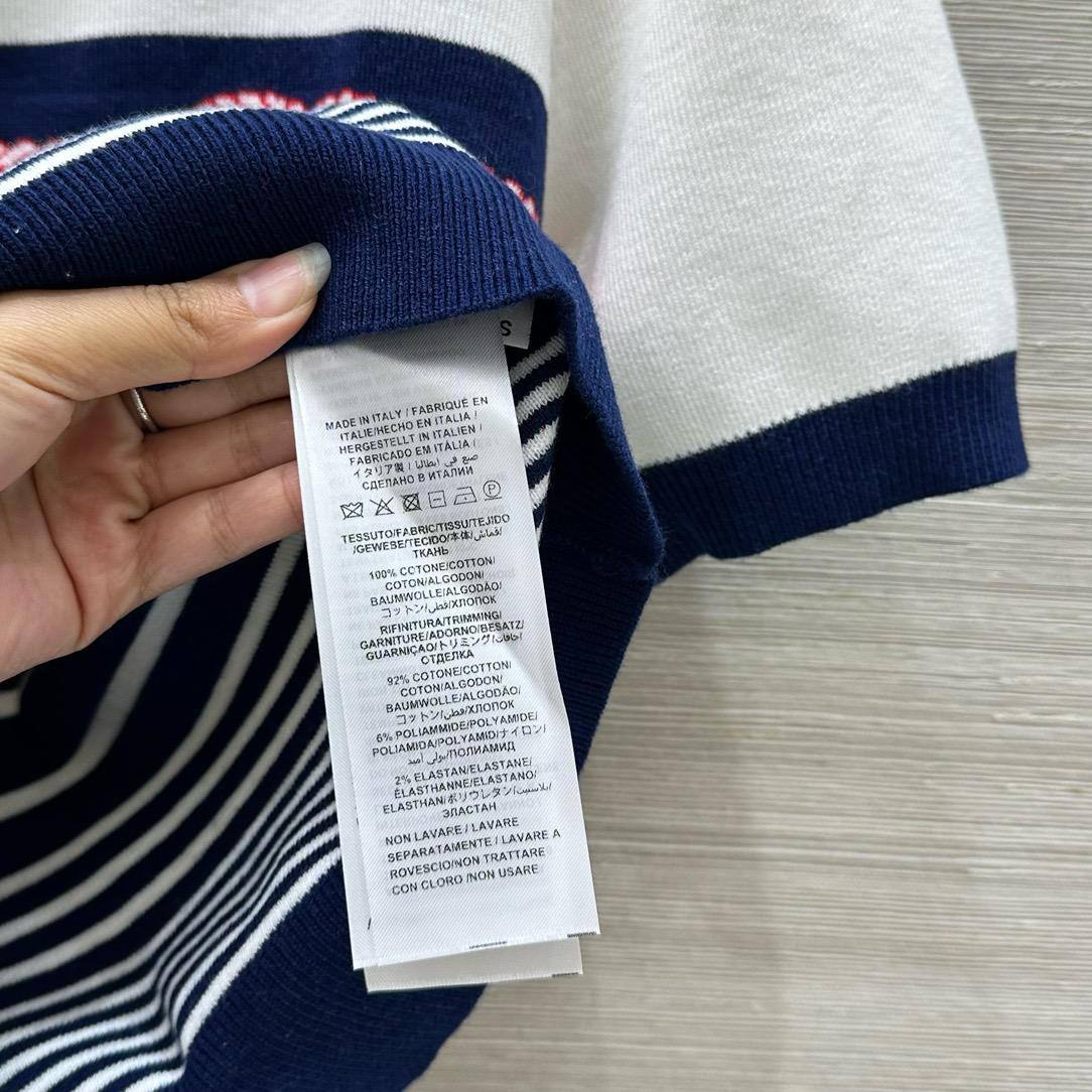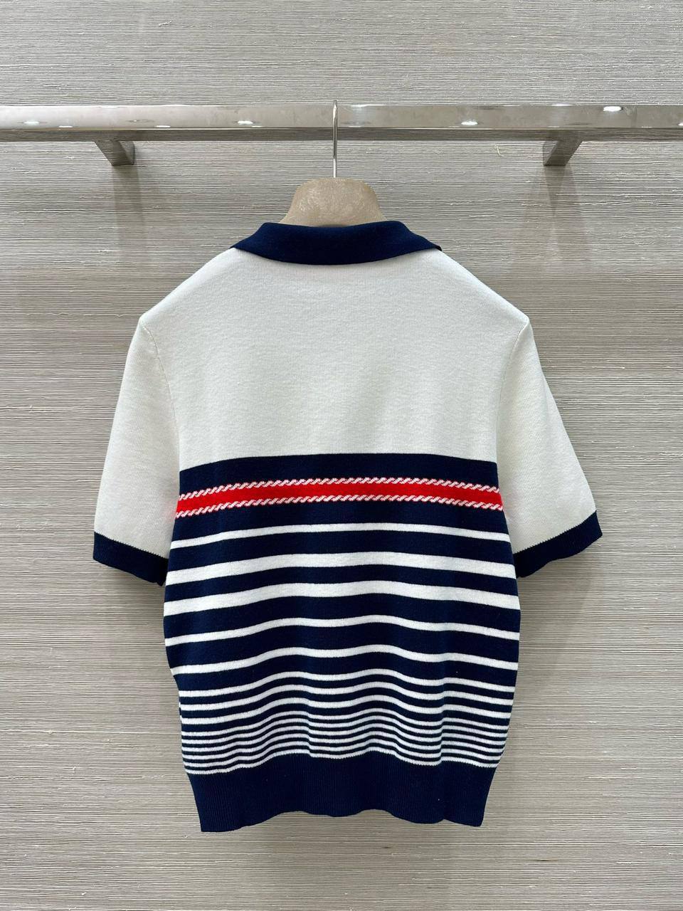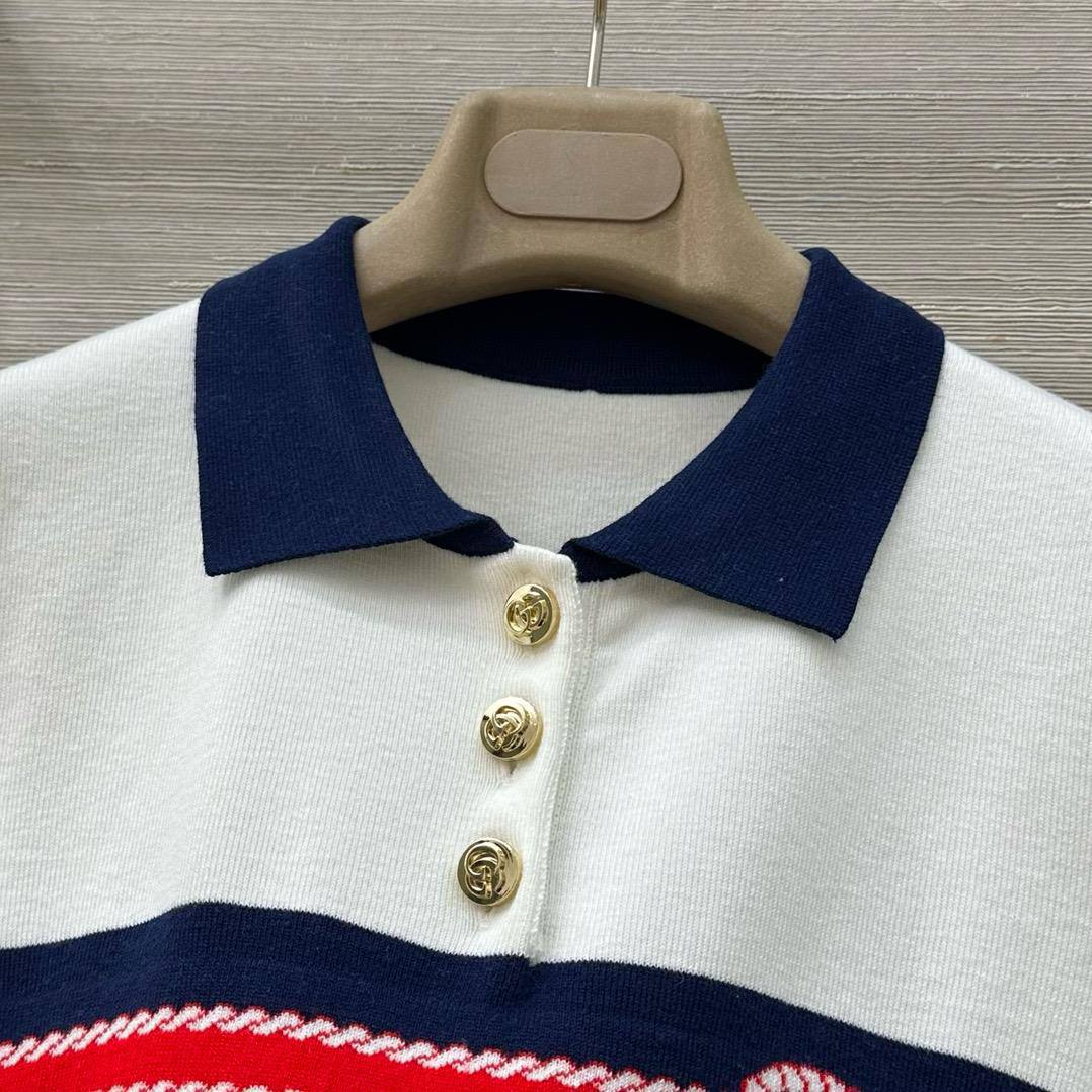 Поло Gucci LUX-119630 — это элегантное поло, которое сочетает в себе классический дизайн и современные элементы. Изделие выполнено в бело-синих тонах с контрастными полосками и деталями, что создает стильный и выразительный образ. Это поло идеально подходит для повседневной носки или для создания более формального наряда.