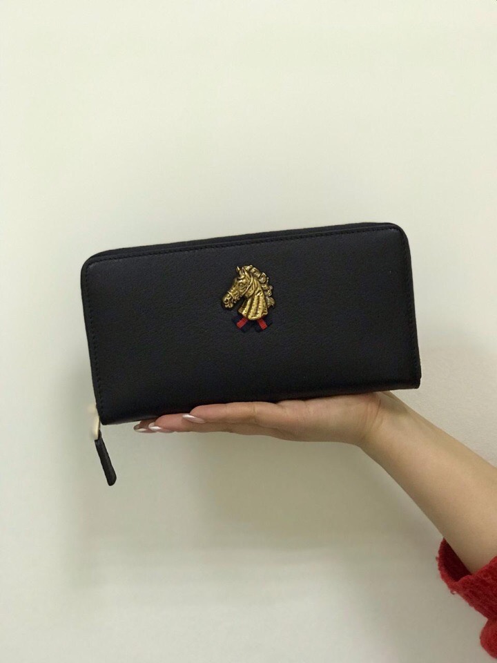 Портмоне Gucci СМ-624 – это стильный аксессуар, выполненный в классическом дизайне. Черный цвет и золотистая фурнитура с изображением головы лошади придают ему элегантный вид, подходящий как для повседневного использования, так и для особых случаев. Это портмоне станет отличным дополнением к образу современной женщины, ценящей качество и изысканность.
