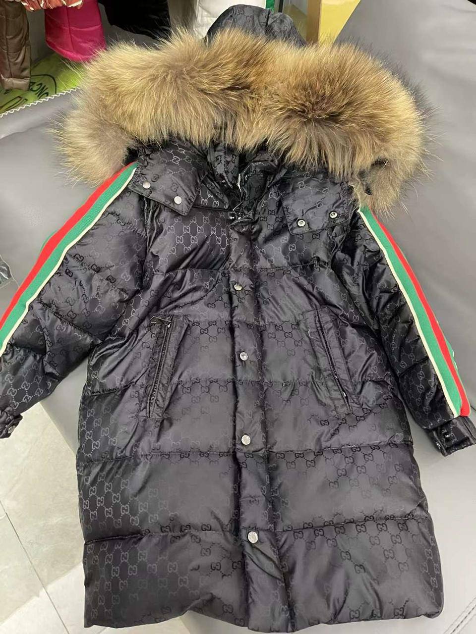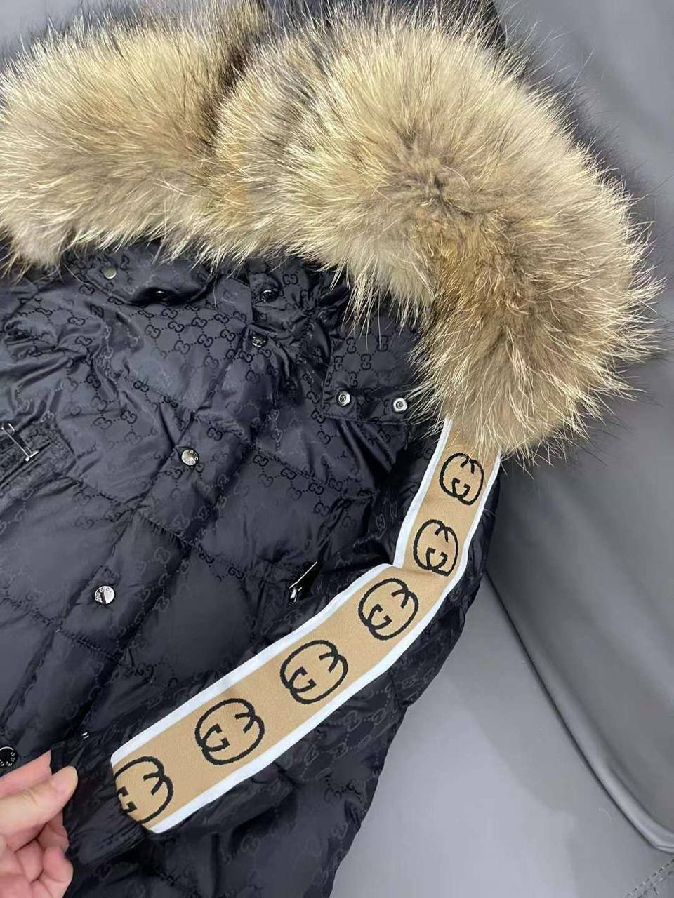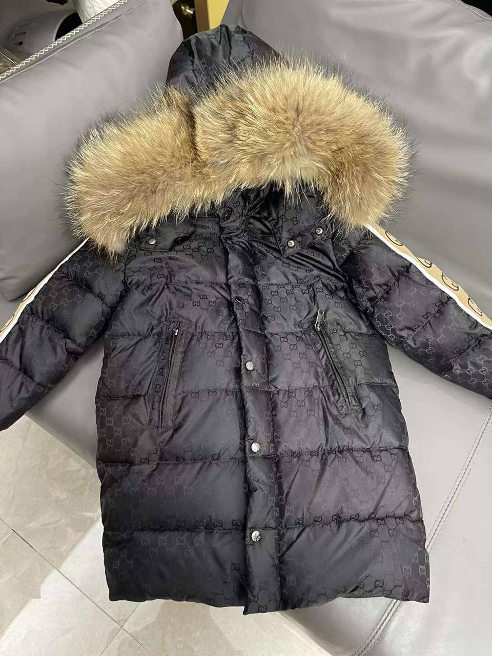 Пуховик Gucci LUX-112919 – это стильная зимняя куртка, сочетающая в себе роскошь и комфорт. Модель выполнена в черном цвете с узнаваемым монограммным принтом бренда. Декоративные элементы в виде полосок на рукавах и отделка капюшона мехом добавляют изделию выразительности.