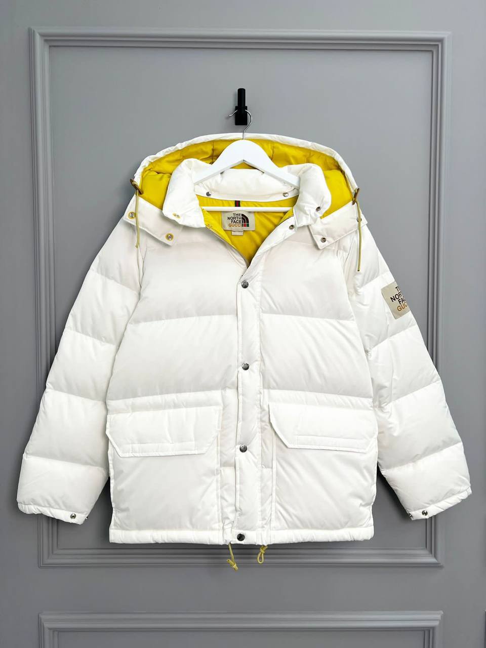Пуховик Gucci LUX-76892 – это стильная и теплая верхняя одежда, сочетающая в себе модный дизайн и функциональность. Белый пуховик с желтой подкладкой, с капюшоном и накладными карманами, подойдет для создания как повседневных, так и более элегантных образов в холодное время года.