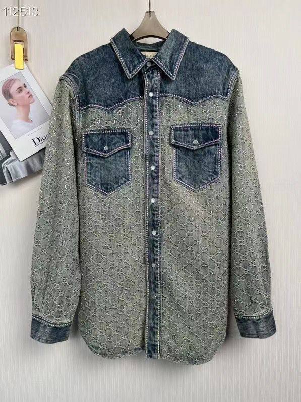 Эта рубашка Gucci LUX-66613 представляет собой стильное сочетание классического денима с изысканными деталями. Верхняя часть и манжеты выполнены из темно-синего денима, а основная часть изделия украшена узором в виде монограммы бренда, дополненной мерцающими стразами. Оригинальный крой и выразительный дизайн делают эту рубашку идеальным выбором для создания запоминающихся образов.