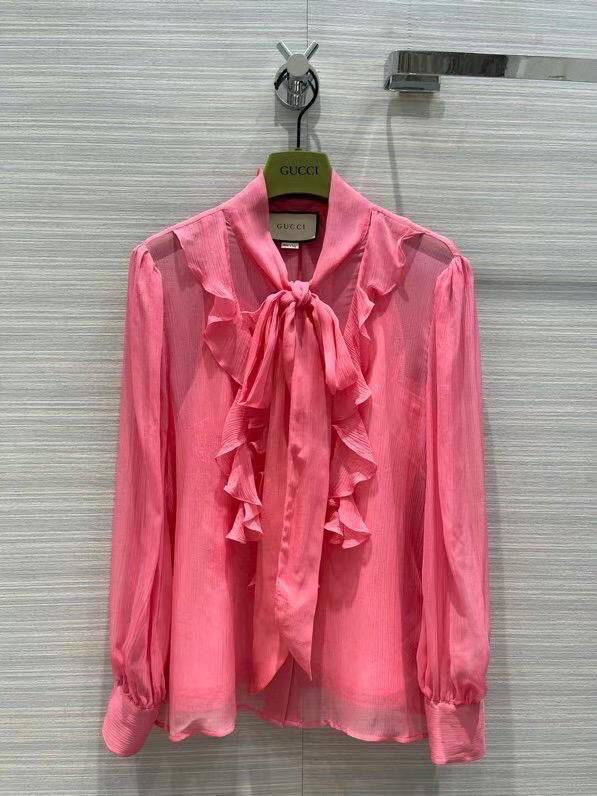 Рубашка Gucci LUX-70524 – элегантная и стильная блузка от известного бренда. Розовая рубашка с длинными рукавами и пышными оборками на воротнике и по переду. Тонкая ткань создает женственный и воздушный образ, идеально подходящий для создания утонченного стиля.
