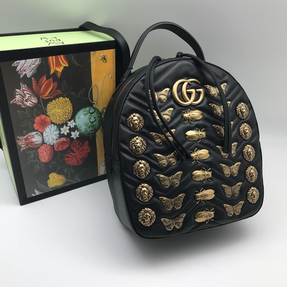 Рюкзак женский Gucci СЖ-173 представляет собой стильный аксессуар, сочетающий в себе узнаваемый дизайн бренда Gucci и оригинальные декоративные элементы. Чёрный цвет и стёганый узор придают ему элегантность, а золотистые аппликации в виде бабочек, жуков и львиных голов добавляют уникальности и роскоши. Этот рюкзак станет ярким акцентом в любом образе, идеально подойдёт для тех, кто ценит высокое качество и эксклюзивный стиль.